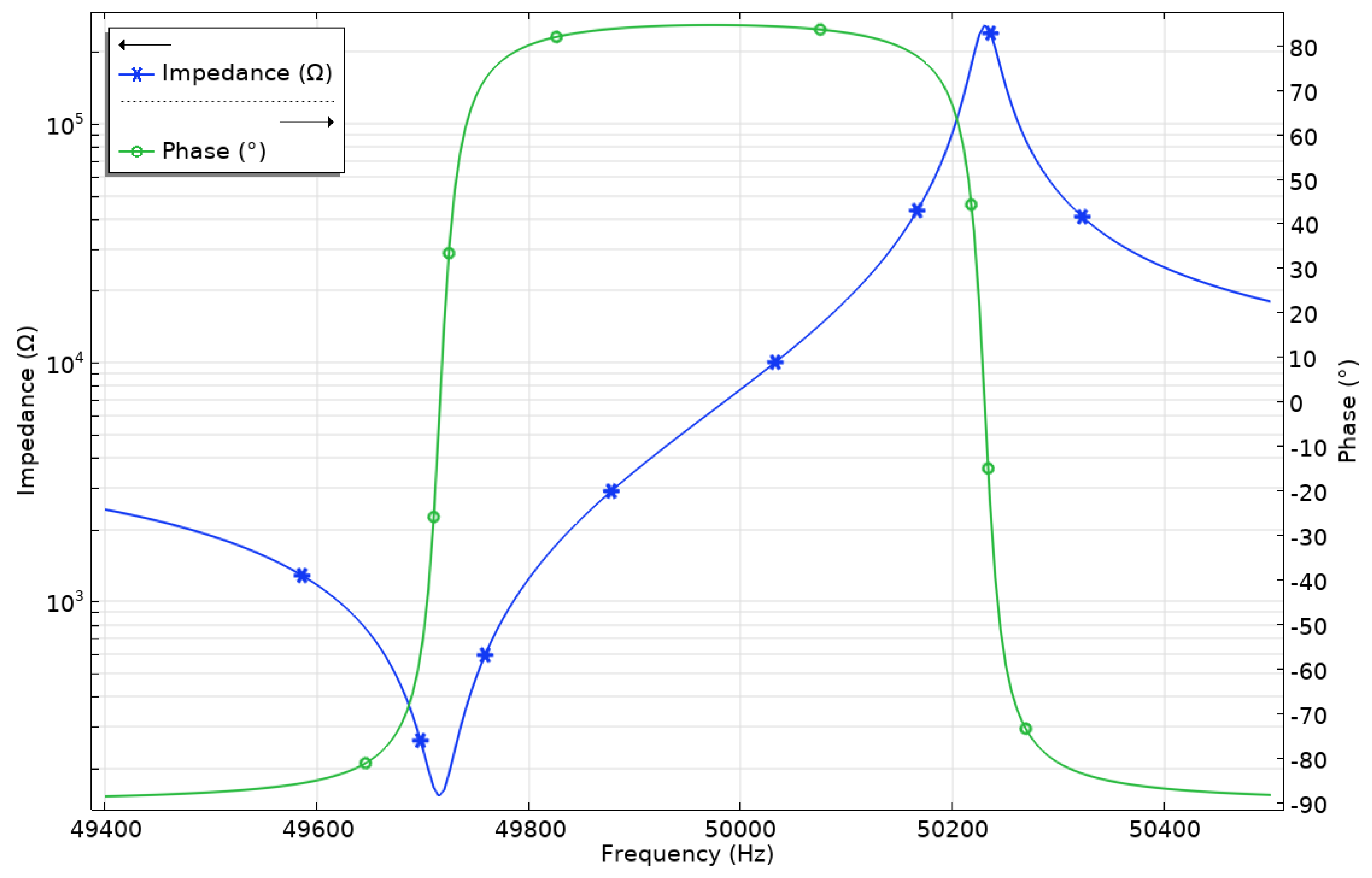 The next stage of the numerical investigation was dedicated to calculations of the impedance and phase frequency characteristics of the ultrasonic acoustic pressure source. The boundary conditions for these calculations were set as in the previous case, while the frequency range under analysis, considering the results of the modal analysis, was set from 49.4 to 50.5 kHz with increment steps of 5 Hz. The results of the calculations are shown in Figure 6.