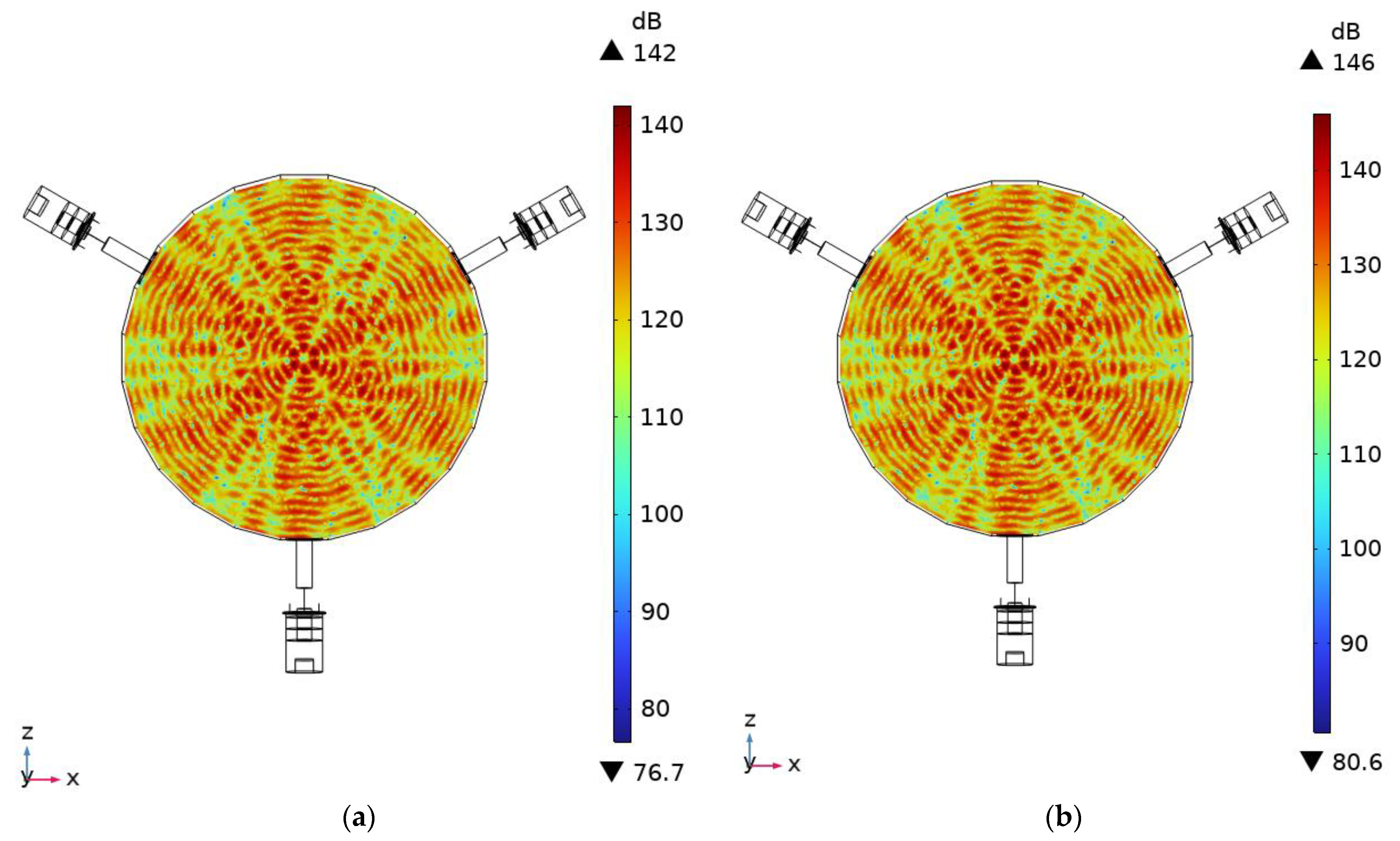 The next stage of numerical investigations was dedicated to calculating the chamber’s acoustic characteristics and indicating interference field patterns while the ultrasonic acoustic pressure sources were driven by their resonance frequency. For this purpose, a numerical model of the acoustic agglomeration chamber was built. Boundary conditions for ultrasonic acoustic pressure sources were set as in the previous cases, while three sources were placed as in Figure 4, i.e., the angular, distance between sources was set to 120° while the internal diameter of the chamber was set to 149.75 mm. The volume between acoustic pressure sources was filled with air medium with an initial pressure of 101.32 kPa and a temperature of 23 °C. Therefore, the first stage of numerical investigation was dedicated to the calculation of SPL values and acoustic field patterns then all acoustic pressure source were driven by harmonic signal with frequency equal to resonance frequency. The calculations were performed in the frequency range from 49.25 kHz to 49.75 kHz with frequency increment steps of 5 Hz, while the excitation signal amplitude was set in range from 25 Vp-p to 125 Vp-p with amplitude increment step of 25 Vp-p. So, with this calculation setup, the SPL values and their distribution patterns in the agglomeration chamber at different excitation signal amplitudes were calculated. The results of calculations while the excitation signal amplitude was set to 25 Vp-p and to 125 Vp-p are given in Figure 7.