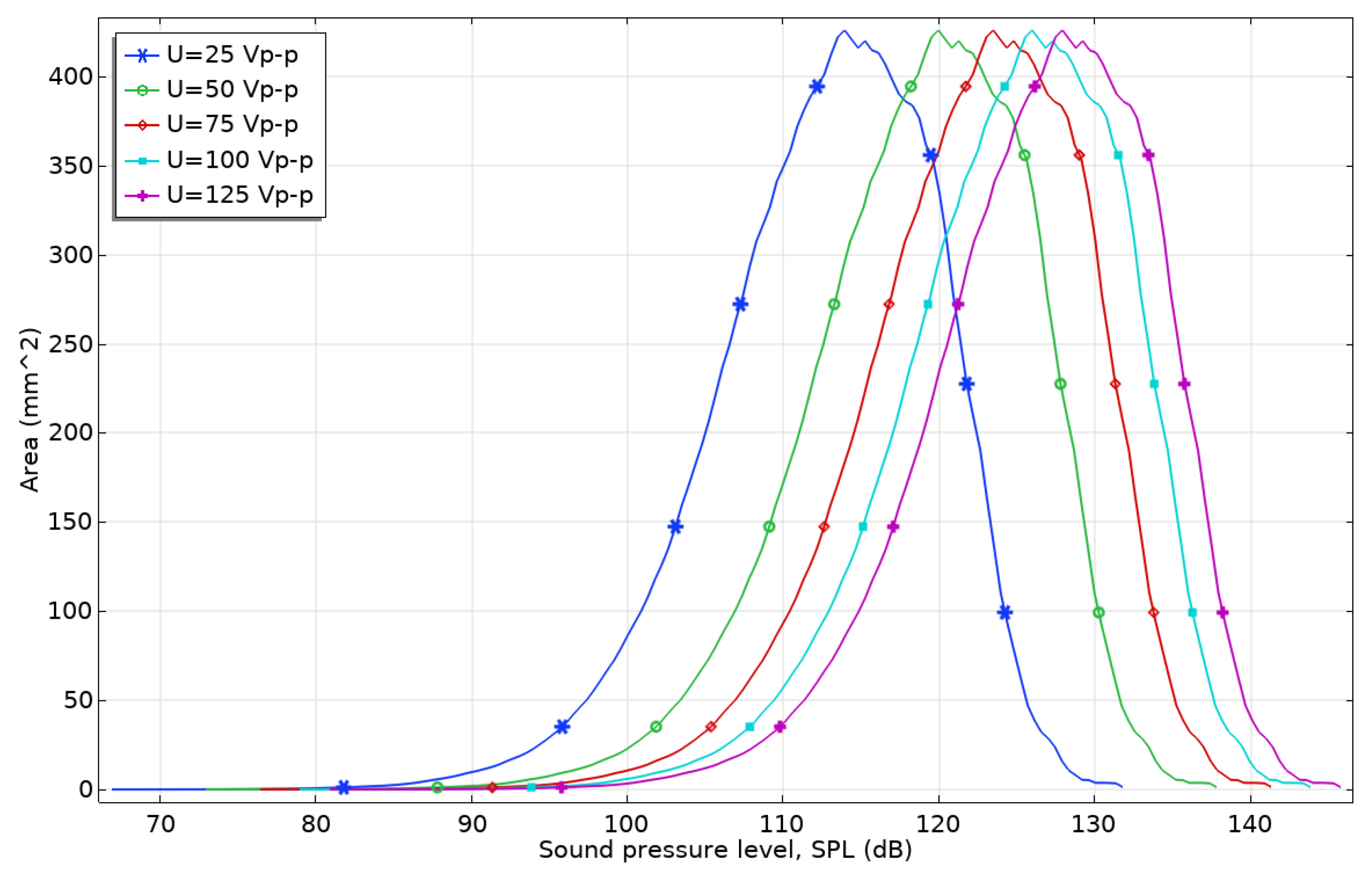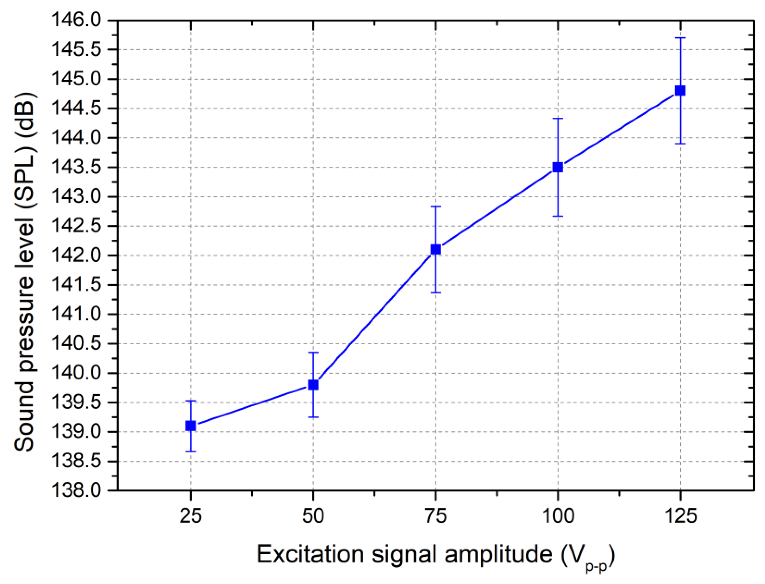 Figure 13. Experimentally measured SPL values at different excitation signal amplitudes.