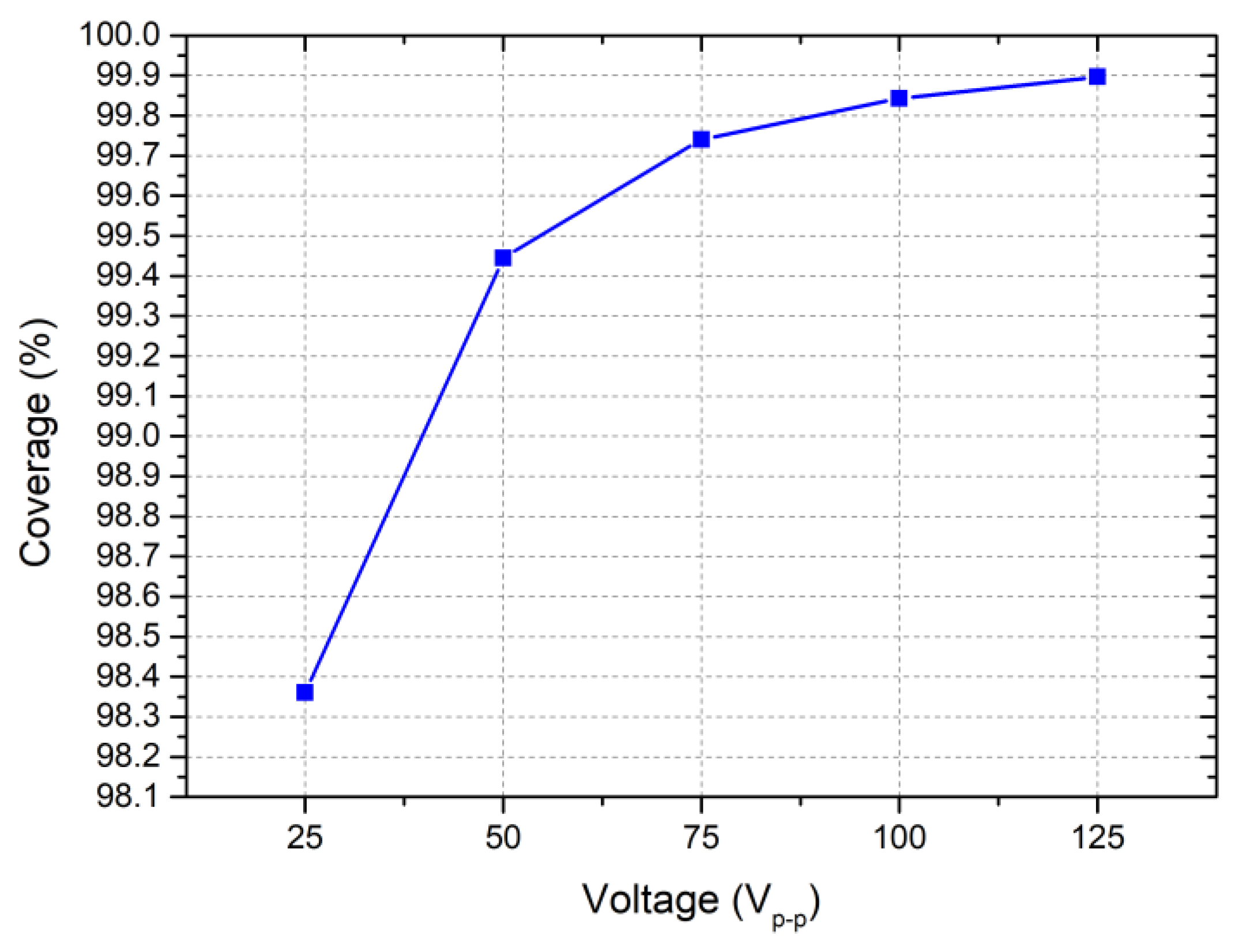 Firstly, the total area of the cross section of the agglomeration chamber is 176.1 cm2 or 17,614.2 mm2. As can be seen in Figure 8, the dominant SPLs at all excitation signal amplitudes were 430 mm2 or around 2.5% of the agglomeration chamber cross section area. However, the analysis of the entire SPL value distribution show that high SPL values, i.e., from, 100 dB to 146 dB, make up almost the entire cross section of the agglomeration chamber. This shows that high SPL values are properly distributed across the agglomeration chamber and are able to ensure an almost even effect of pressure on particles at different positions in the airflow. Figure 8 also shows that the dominant SPL values shift from 113 dB at 25 Vp-p to 128 dB at 125 Vp-p, i.e., 15 dB, while the change in excitation voltage is 100 Vp-p or 0.15 dB/Vp-p. Also, on the basis of Figure 8, it can be found that the coverage level within the chamber is closely tied to the extent of constructive interference generated by the acoustic fields. At lower excitation signal levels, the regions of constructive interference are smaller, leading to lower coverage. However, as the sound pressure level (SPL) increases, the zones of constructive interference expand correspondingly. This enlargement enhances the effective coverage of the acoustic field throughout the chamber. Thus, higher excitation amplitudes contribute to a more uniform and extensive distribution of acoustic pressure and as a result improve the agglomeration process. Such characteristics, as well as Figure 8, show that the agglomeration chamber shows an almost linear response to excitation signal amplitudes, which ensures a simple driving and control system as well as the possibility of flexibility in adjusting acoustic characteristics to changes in particle concentrations and size spectrum in the airflow.