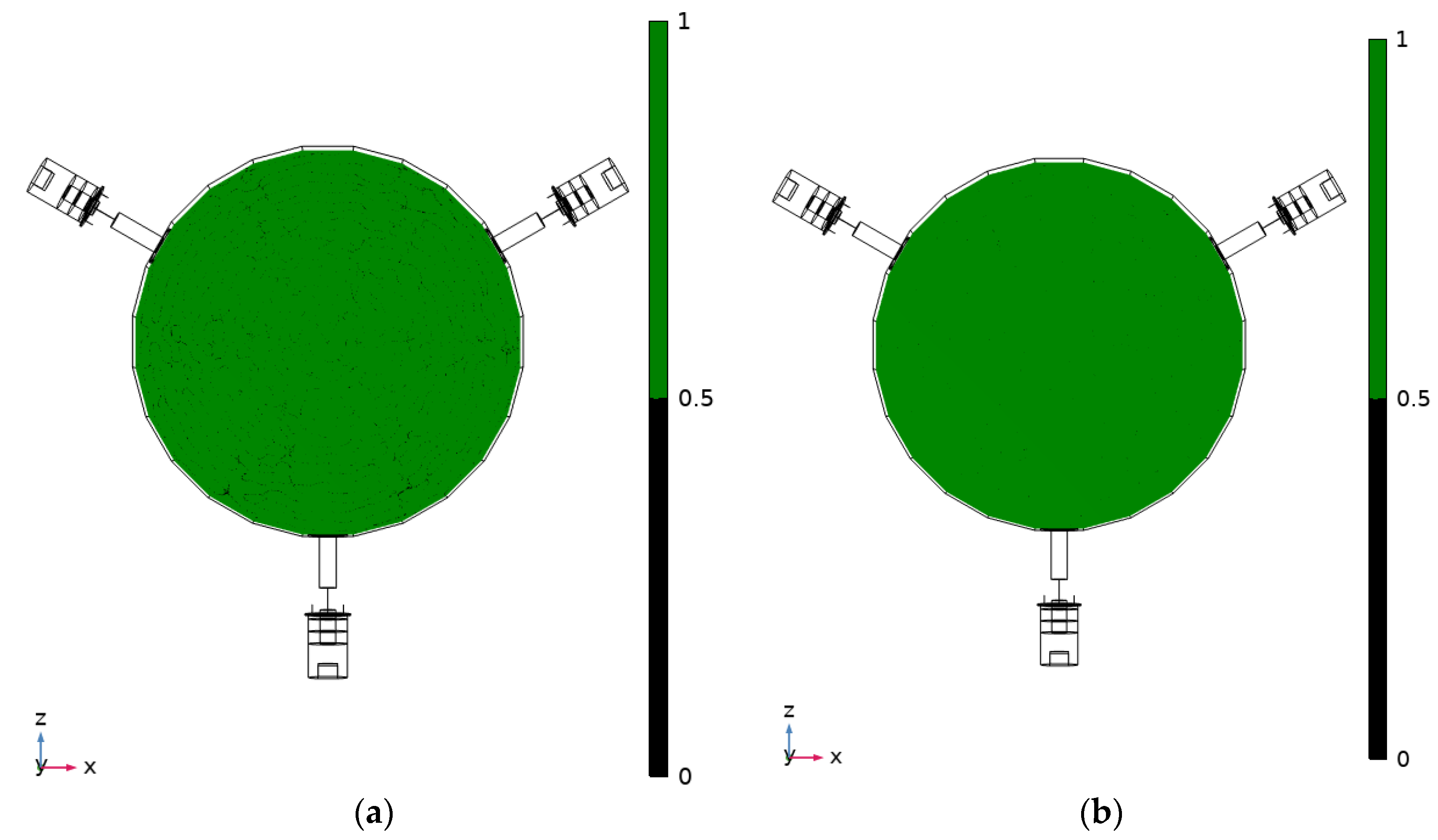 The binary exceedance maps (Figure 10) with a 100 dB threshold confirm the results given in Figure 9 and show that the SPL values at the lower amplitude of 25 Vp-p, in most cases, are located around the nodes of the interference acoustic field (Figure 10a). Figure 10b shows that these lower-pressure regions almost vanish compared to the case with 25 Vp-p. These results show that the usage of interference acoustic fields in the agglomeration chamber gives the following benefits: high sound pressure levels are almost evenly distributed across the cross section of the agglomeration chamber; the interference acoustic field ensures a high density of high SPL values; and the induction of constructive interference increases SPL values across the entire cross section of the agglomeration chamber. Therefore, on the basis of these results, it can be concluded that our numerical investigations show great potential for designing ultrasonic agglomeration chambers to improve the agglomeration process of solid fine and ultrafine particles.