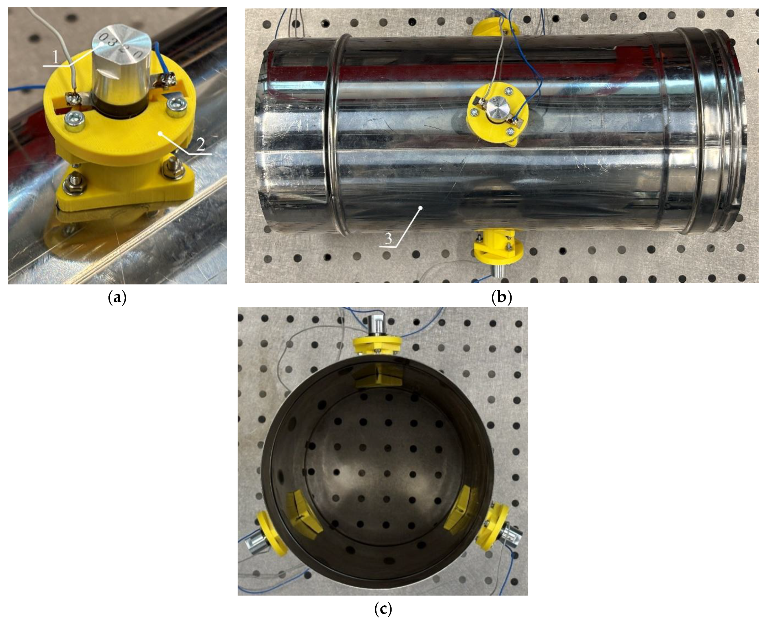 Figure 11. Prototype of ultrasonic agglomeration chamber; (a) view of mounted ultrasonic acoustic pressure source; (b) side view of ultrasonic agglomeration chamber; (c) front view of ultrasonic agglomeration chamber; 1—ultrasonic piezoelectric acoustic pressure source; 2—clamping of ultrasonic piezoelectric acoustic pressure source; 3—body of agglomeration chamber.