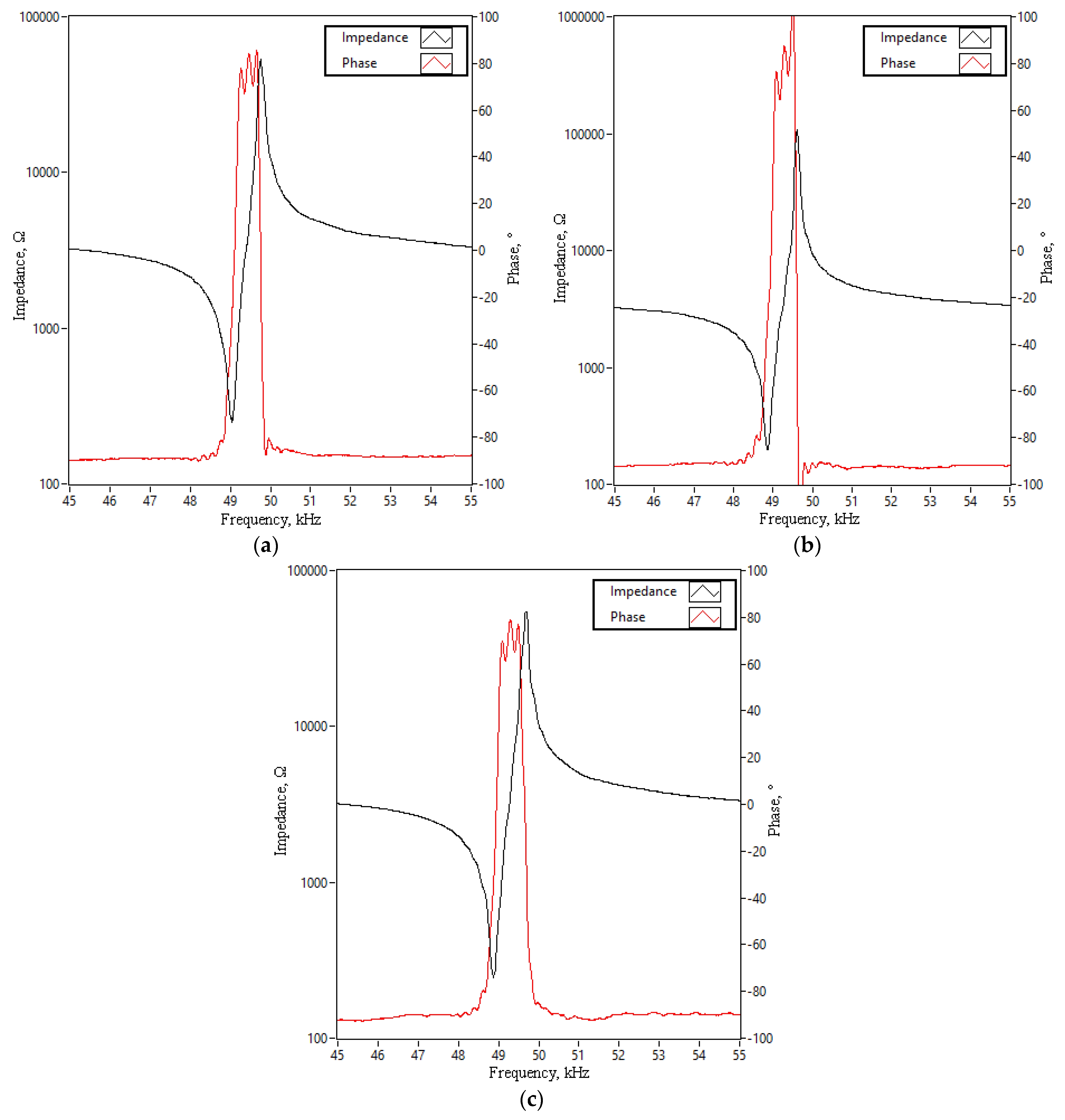 The first stage of experimental investigations was dedicated to measurements of the impedance and phase frequency characteristics of each ultrasonic acoustic pressure source. The aim of the measurements was to indicate the resonance frequencies as well as the effective coupling coefficient of each ultrasonic acoustic pressure source. The measurements were performed in series, i.e., starting from the first UAPS and ending with the third (Figure 4). The impedance and phase frequency characteristics were measured by a SinPhase 16777k impedance analyzer (Hinterbruehl, Austria), which was set to perform measurements in the range from 45 kHz to 55 kHz with increment steps of 5 Hz. During experimental investigation, the ultrasonic acoustic pressure sources (UAPSs) were fixed to the body of the ultrasonic acoustic agglomeration chamber. The results of the measurements are shown in Figure 12.