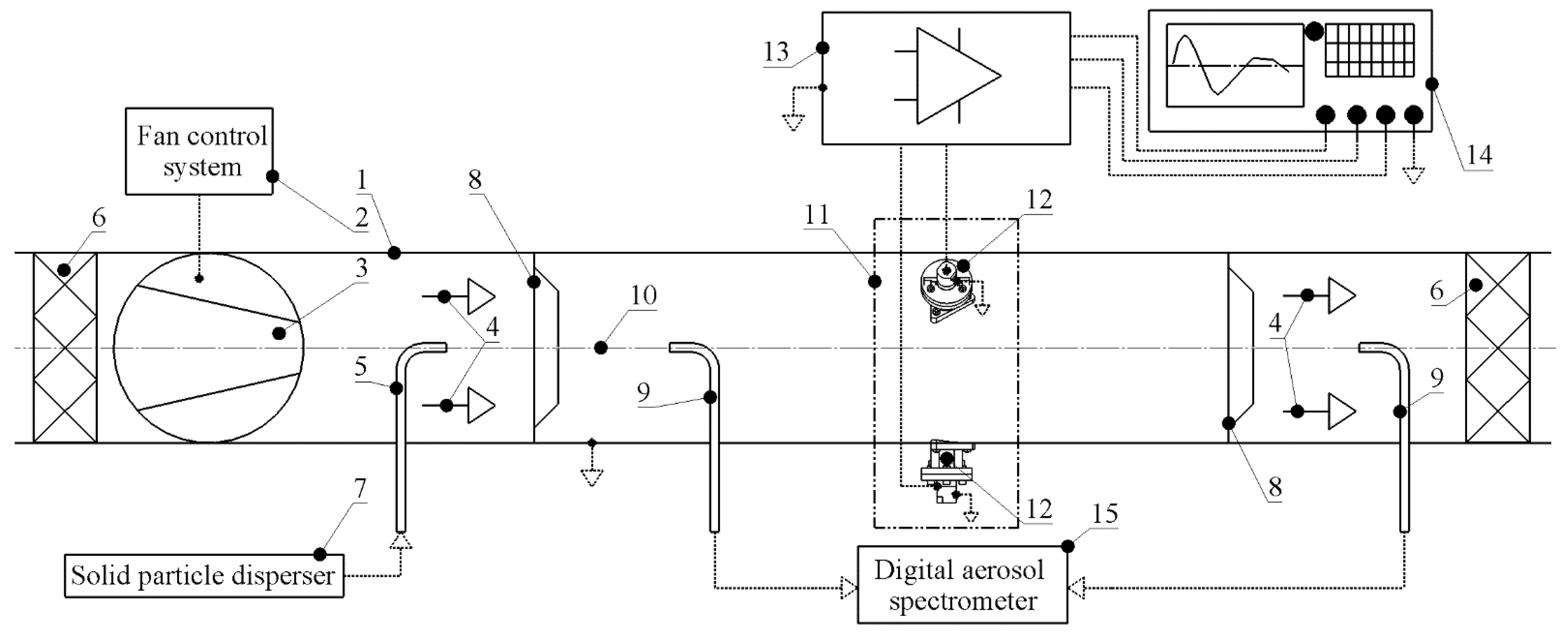 Figure 14. Experimental setup; 1—body of experimental setup; 2—digital fan control system; 3—fan; 4—0.5 m/s airflow direction in the setup; 5—particle injection nozzle; 6—HEPA filter; 7—solid-particle disperser; 8—mixing orifice; 9—particle sampling head; 10—axis of symmetry of the setup; 11—agglomeration chamber; 12—UAPS driven individually at its resonance frequency; 13—power amplifier; 14—excitation signal generator; 15—digital aerosol spectrometer. Reprinted with permission from Čeponis, A. et al. [28] © 2026 Elsevier.