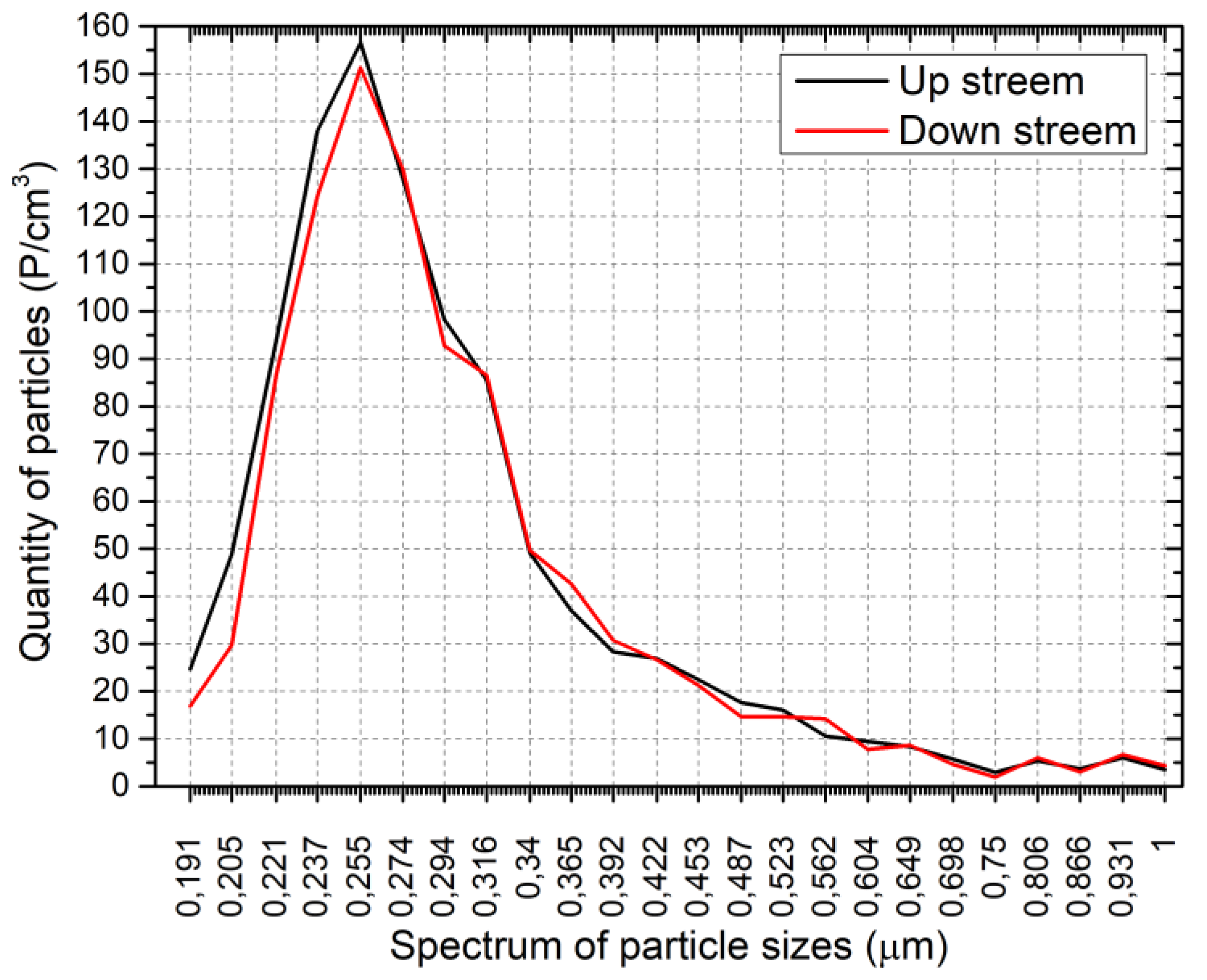 As can be found in Figure 15, the dominant size of particles in the airflow was 255 nm, for a total of 156 particles in a cubic centimetre. The 191 nm sized particles totaled 24.7 pieces in cubic centimetre, while those with a size of 1 µm totaled 5.1 pieces in cubic centimetre. In general, this distribution of particle sizes is close to particulate pollution in normal occupied indoor environments. In addition, the graph shows that particle distribution across the experimental setup is stable, i.e., upstream, and downstream characteristics show a mismatch lower than 7%, which shows that the setup reached stable and controllable particle distribution. Therefore, this particle distribution will be used in further experimental investigations.