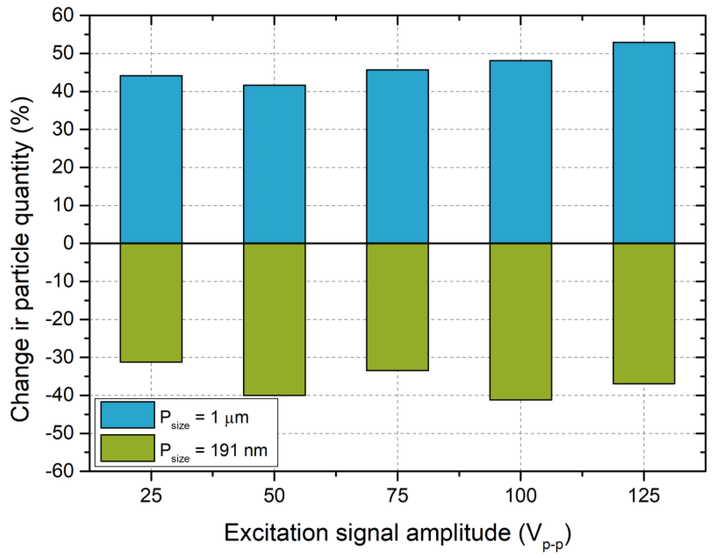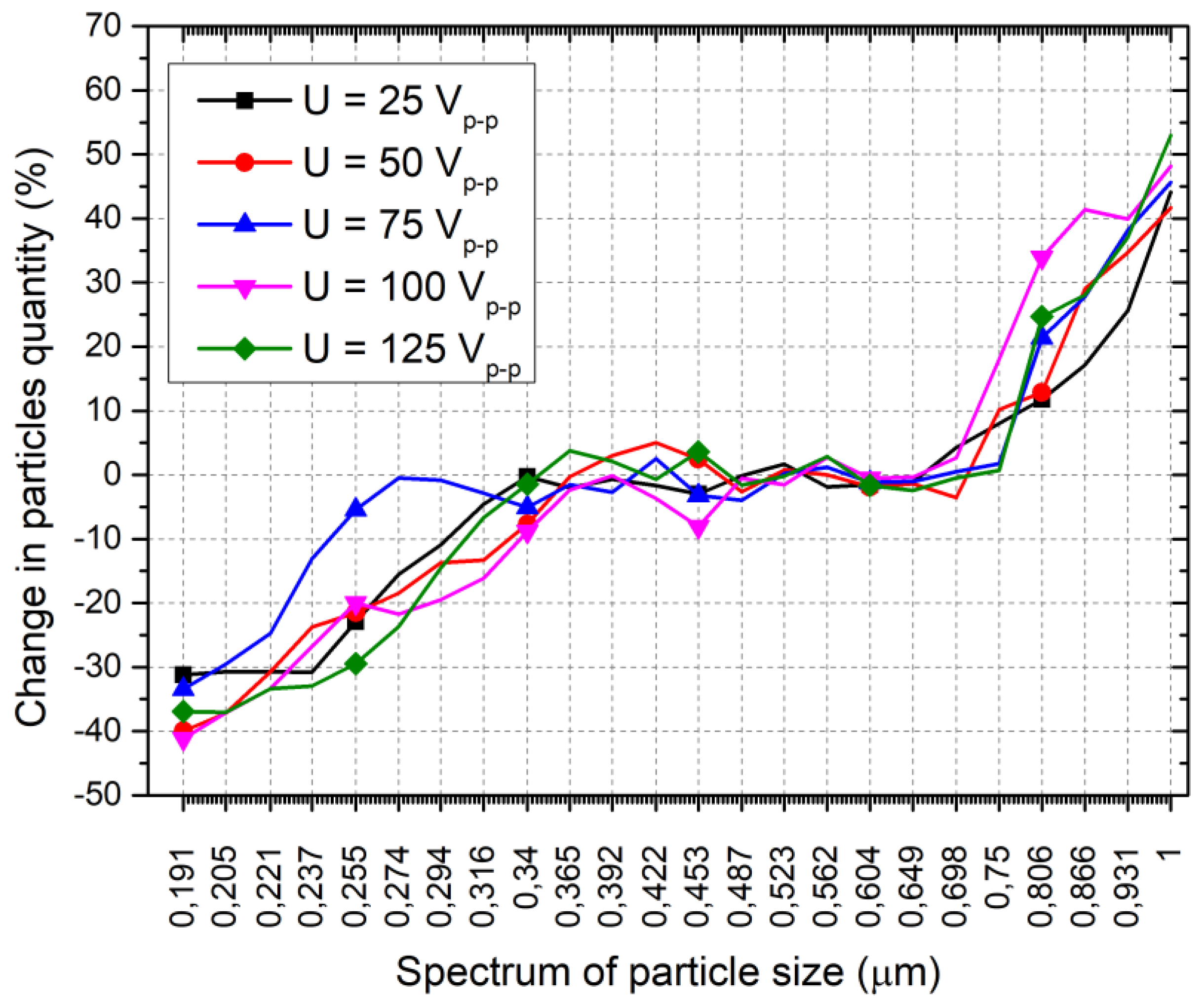 In addition, Figure 16 shows that in the particle size spectrum from 316 nm to 0.69 µm, the changes in quantity are minor and fluctuate in the range from −4.5% to 7.98%. This shows that this spectrum of sizes is intermediate, i.e., the, agglomerates formed from smaller particles enter and remain in this spectrum, while the others form bigger agglomerates and enter the spectrum with bigger sizes. This can be explained by the formation of particle agglomerates and their transition from lower to higher sizes while particle quantities in the intermediate spectrum stay relatively stable. Overall, it can be stated that the usage of an interference acoustic field formed from three high-frequency independent acoustic fields ensures a notable impact on particles in the lowest size spectrum, forming agglomerates which are several times larger. In order to fully represent the results, a summary of changes in the quantities of 191 nm and 1 µm sized particles under different excitation signal amplitudes is given in Figure 17.
