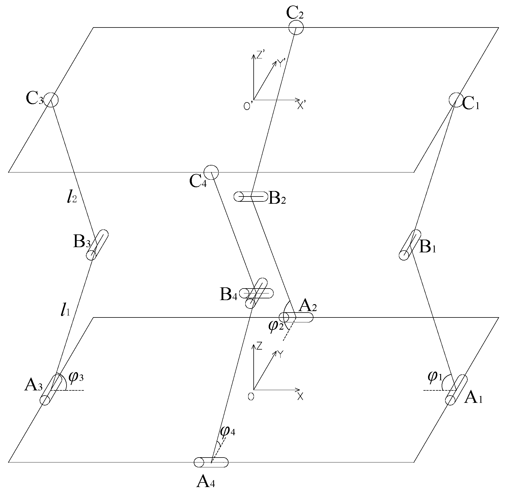 Both the fixed and moving platforms are square in shape, with side length 2a, and the height difference between them is denoted as h. Since the coordinates of point Bi may vary in space, they are defined as (Xi Yi Zi), subject to the condition X < a.