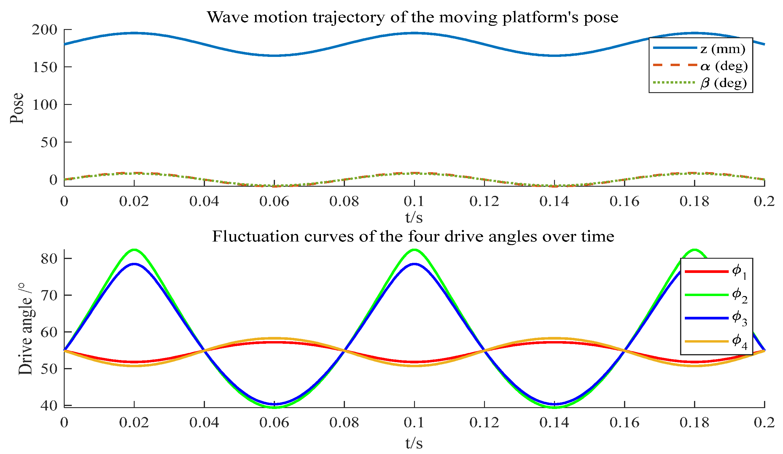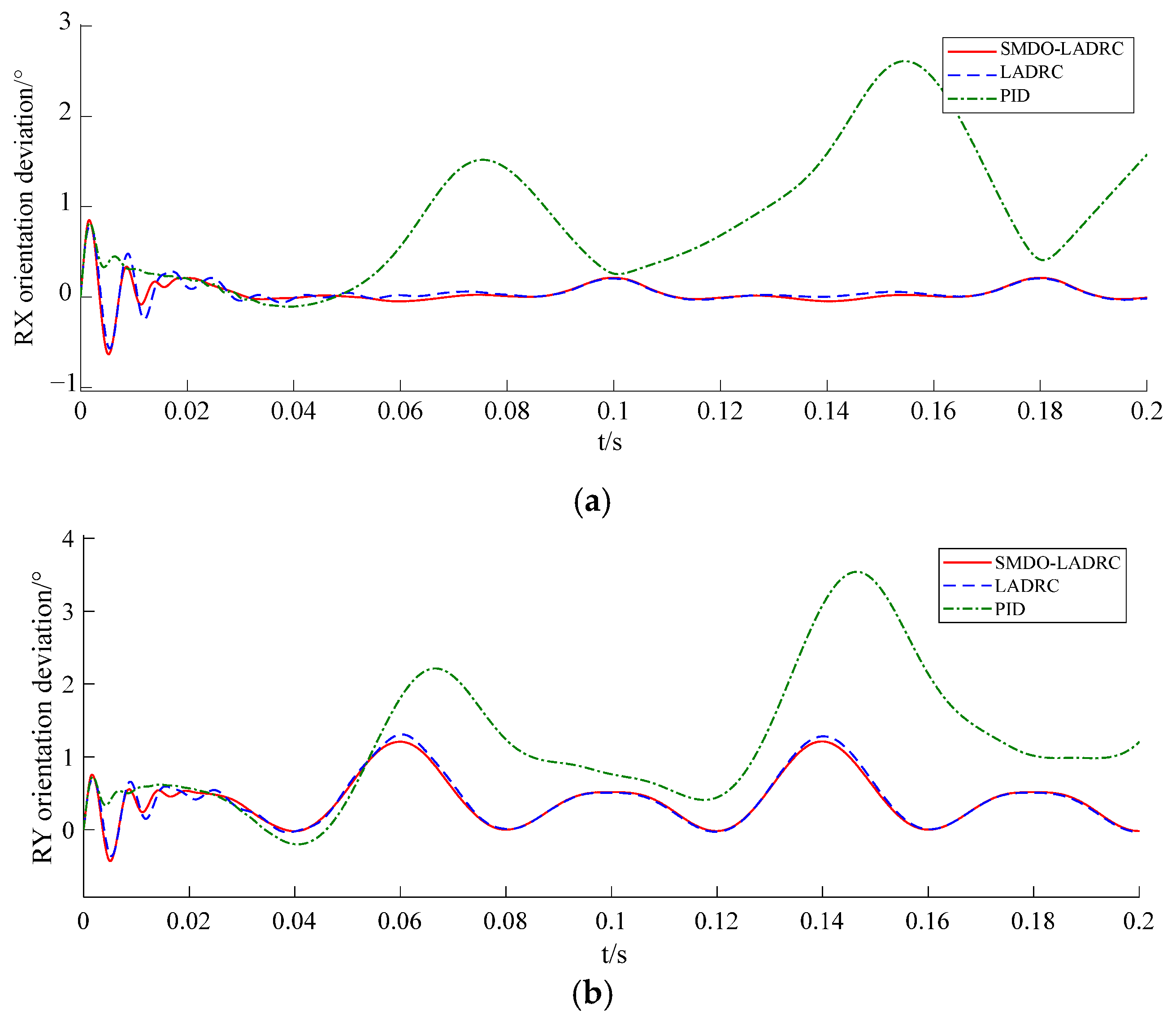 4. A simulation system of the 3RRS–RUS shipborne parallel stabilization platform is established in SimMechanics. The driving joint angles are obtained from the desired wave-induced motions of the moving platform through inverse kinematics and assigned to the servo motors. By applying output torque to the driving joints and feeding back joint angles to the motors, closed-loop control is realized. The simulation results demonstrate that the proposed SMDO–LADRC exhibits strong tracking performance, high robustness, and excellent disturbance rejection, and they further validate the feasibility of the designed three-degree-of-freedom 3RRS–RUS parallel stabilization platform.