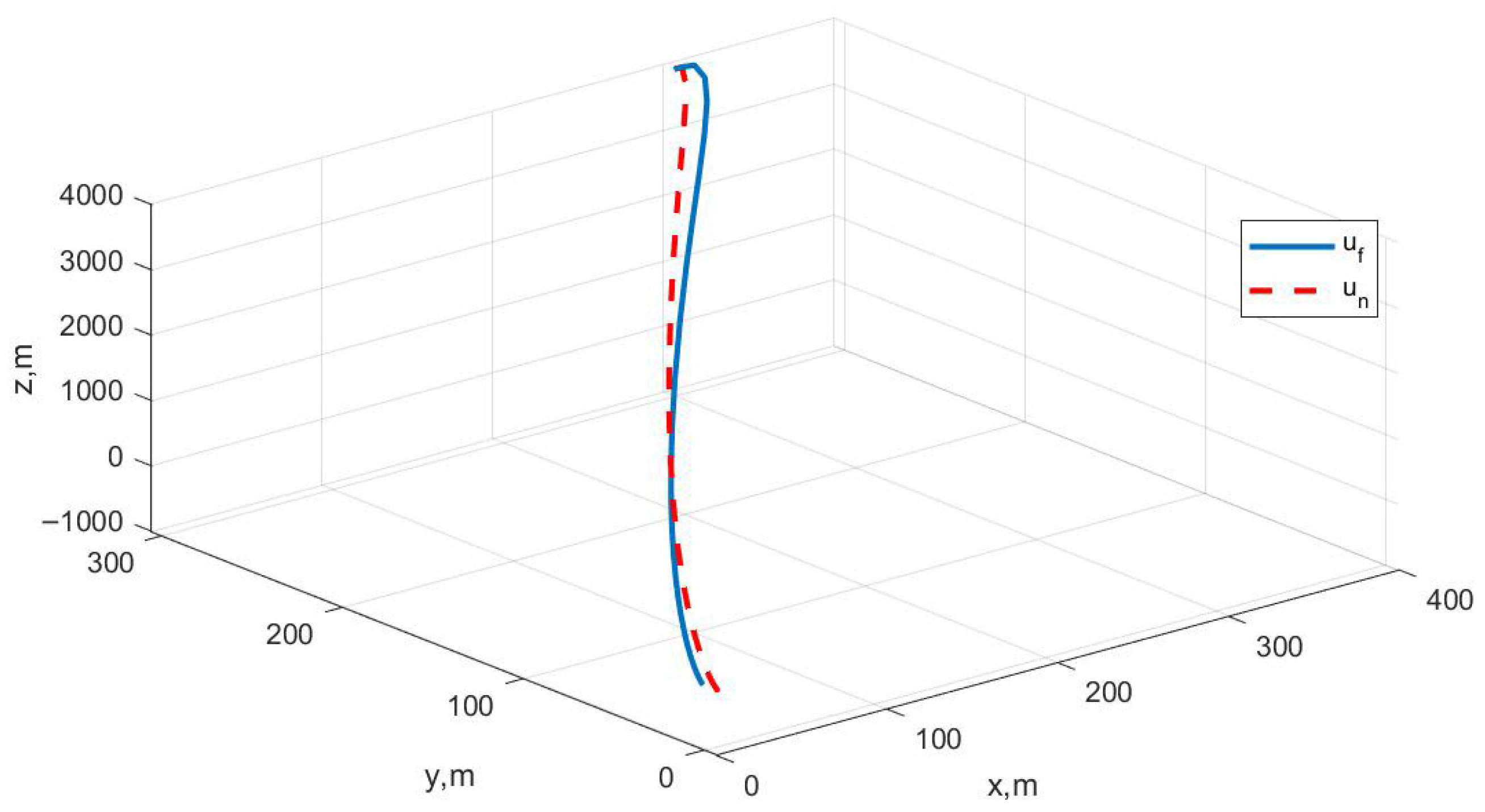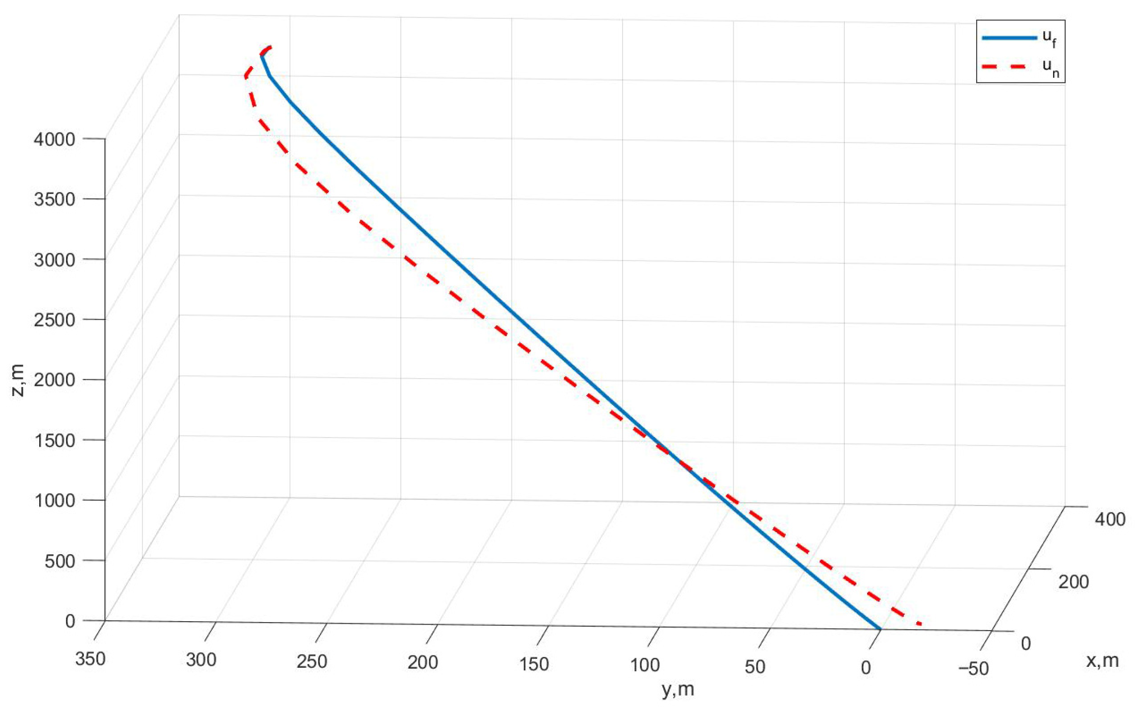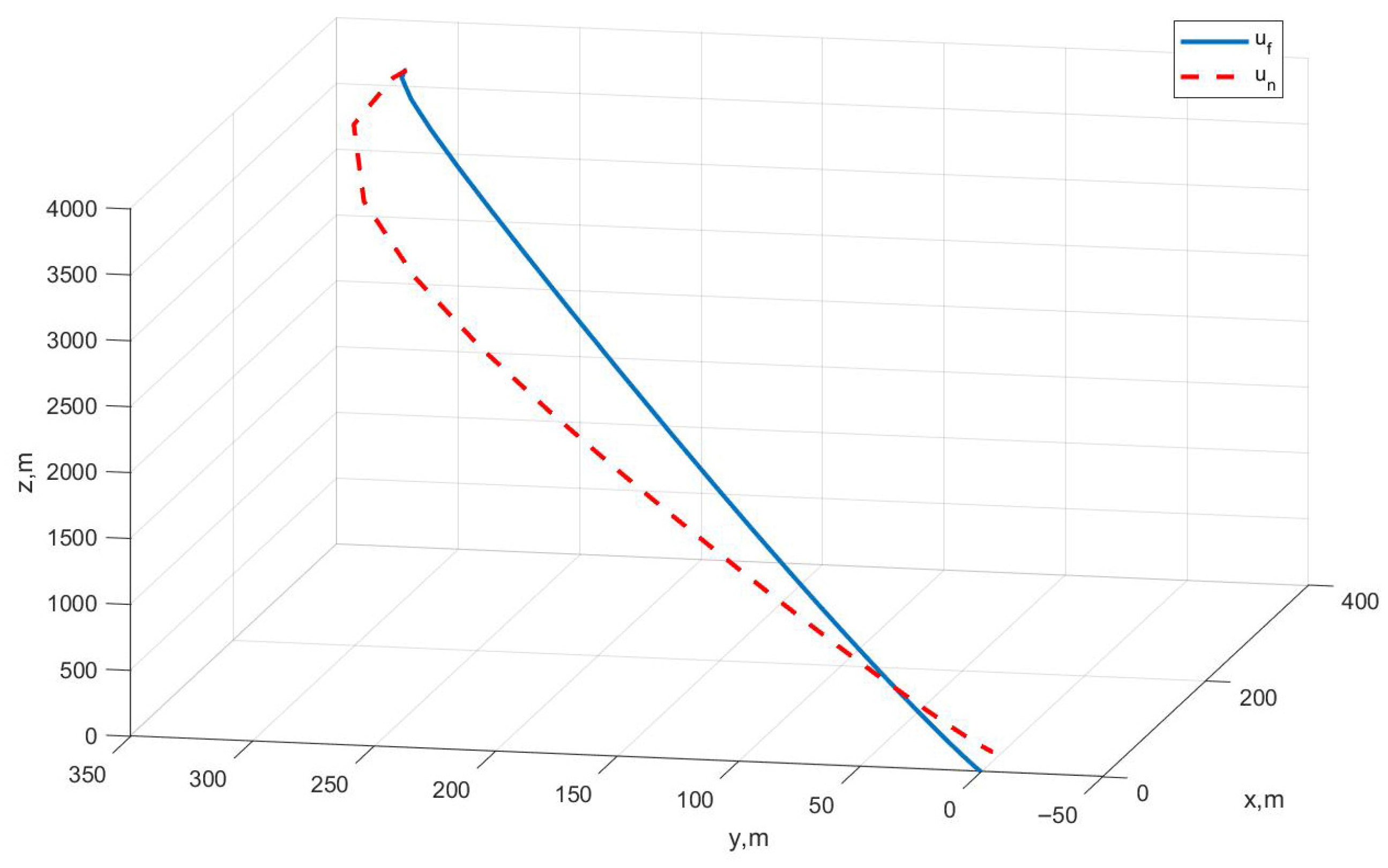 The basis function selected in the controller design is φ ( t ) = ψ ( t ) = x y z V x V y V z   r   V . According to the controller designed in this paper, simulations were first conducted under fault-free conditions. The proposed FTC is marked as u f , while a normal controller without considering the fault is marked as u n . The following three cases are considered in the simulation: