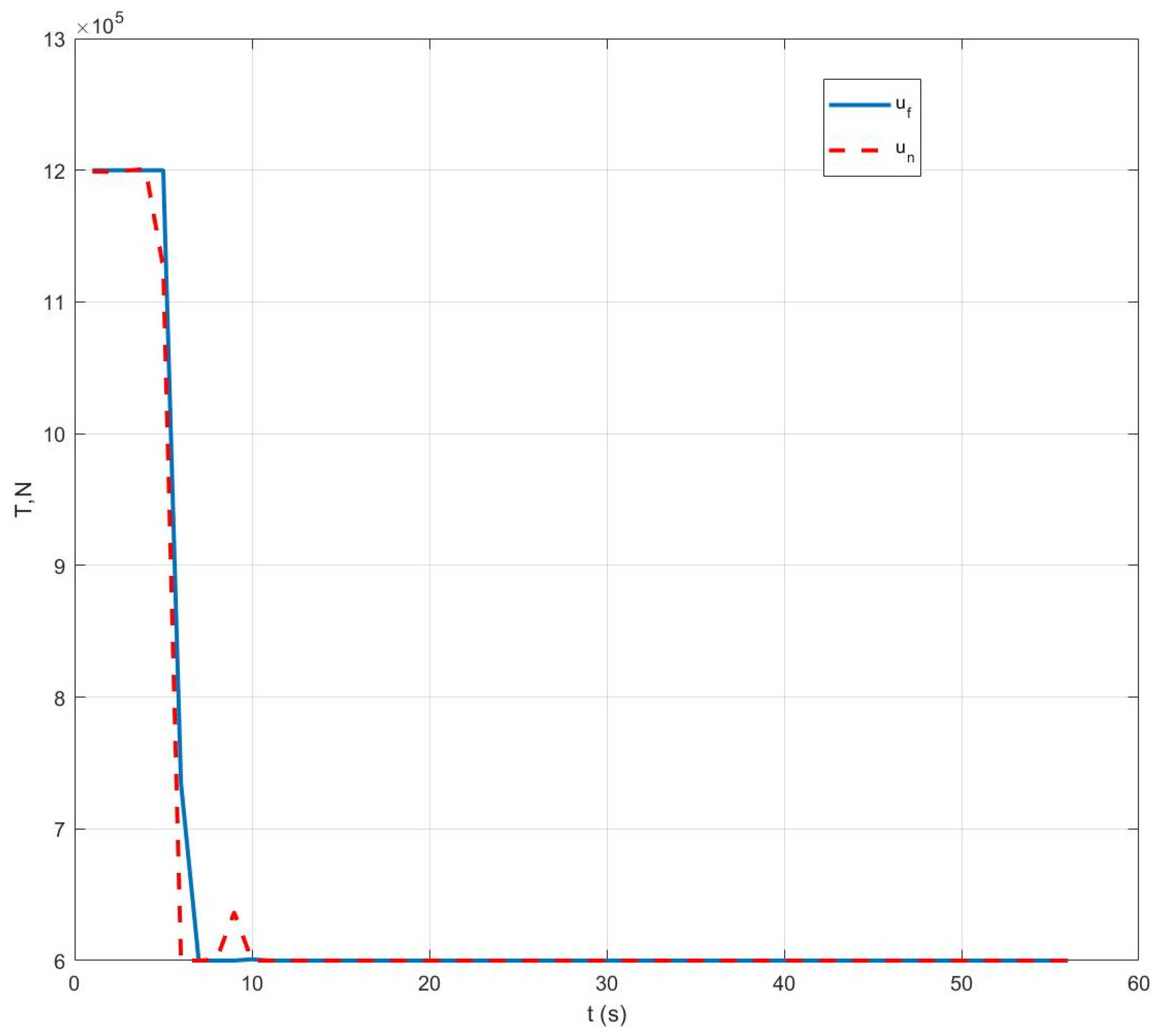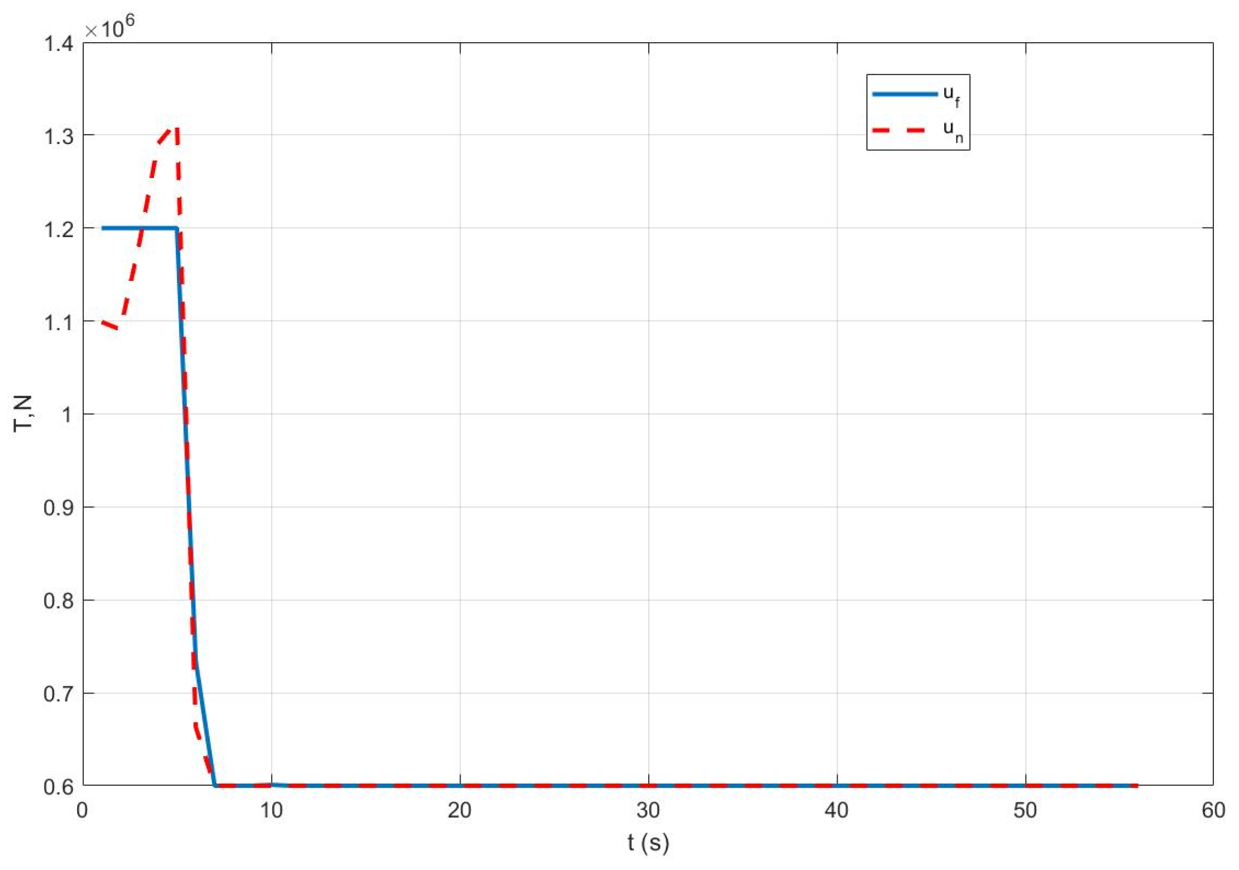 where T d denotes the desired thrust of the rocket, i.e., the thrust required under fault-free conditions; T x represents the actual thrust that the rocket can provide; and η ( t ) indicates the thrust efficiency of the rocket, with 0 < η ( t ) 1 . In this scenario, the rocket experiences a partial failure fault. Considering the actual occurrence of faults in the rocket, the efficiency η ( t ) is unknown. Under this fault mode, the rocket control problem can be transformed into the following:
