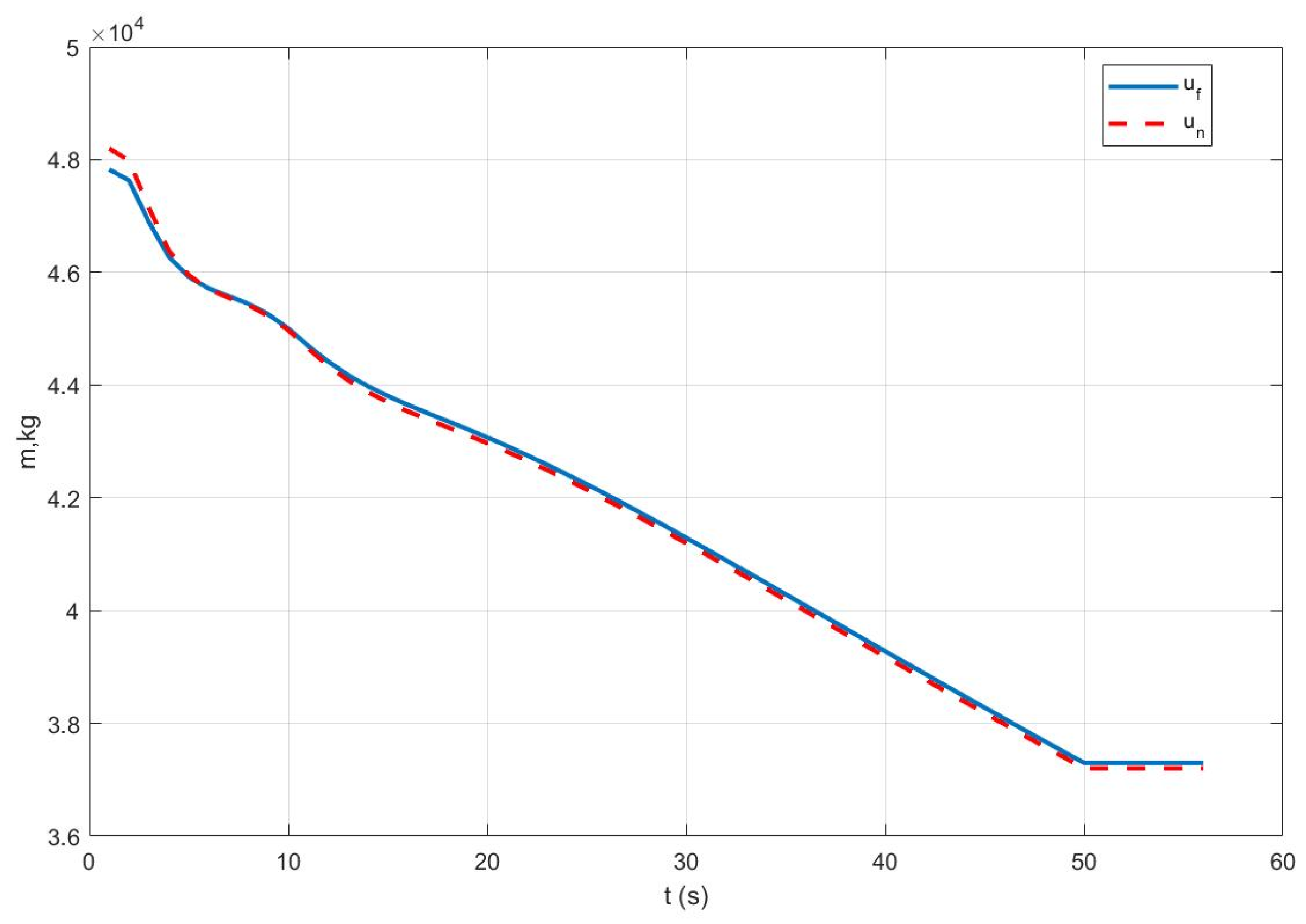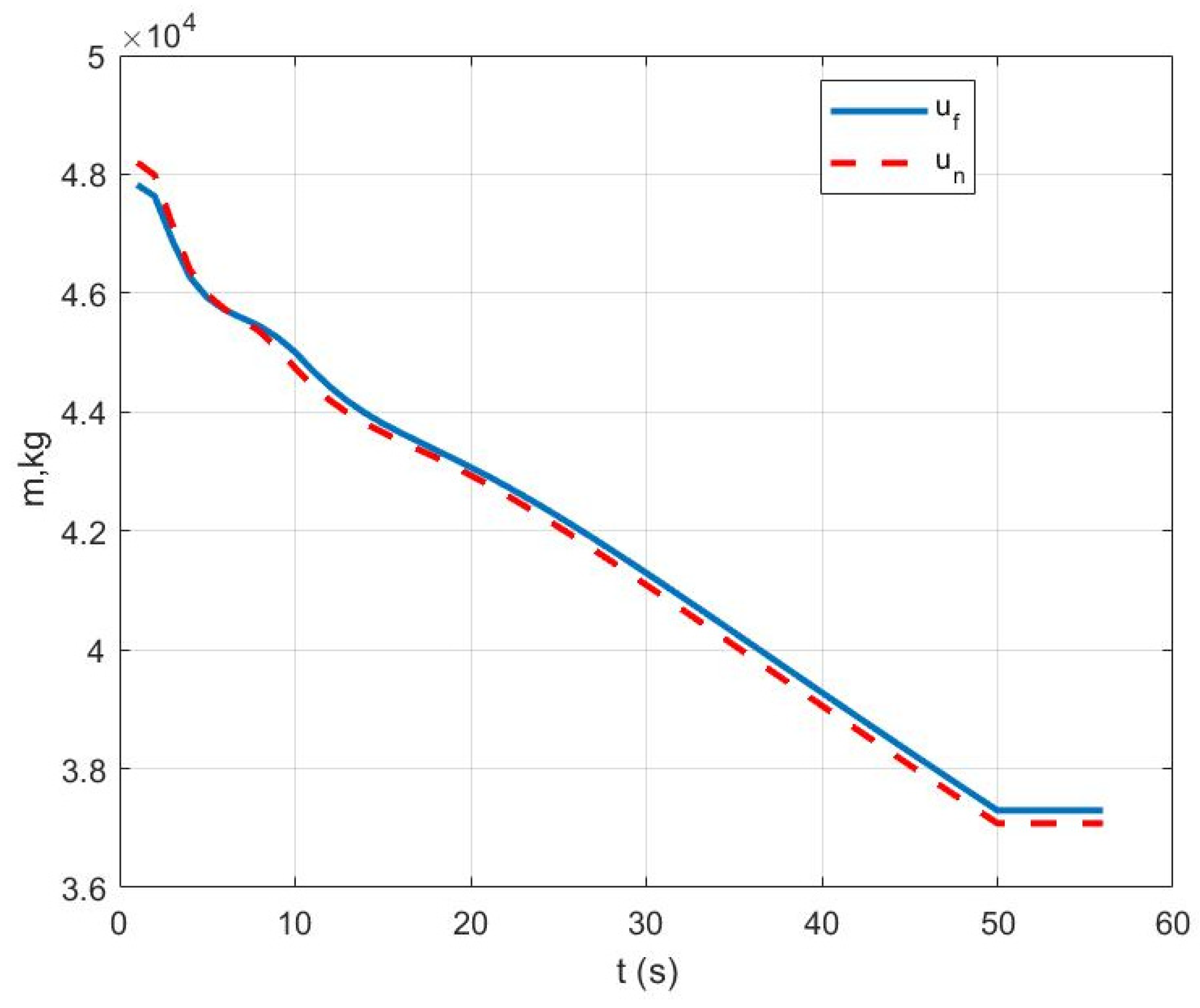 Case II: Figure 5 represents the position variation curve, Figure 6 represents the velocity variation curve, Figure 7 shows the rocket’s thrust variation curve, and Figure 8 depicts the rocket’s mass variation curve. As shown in the figures, under sensor fault, the designed FTC u f achieves the stable control of the rocket under fault-free conditions and ensures a stable landing.