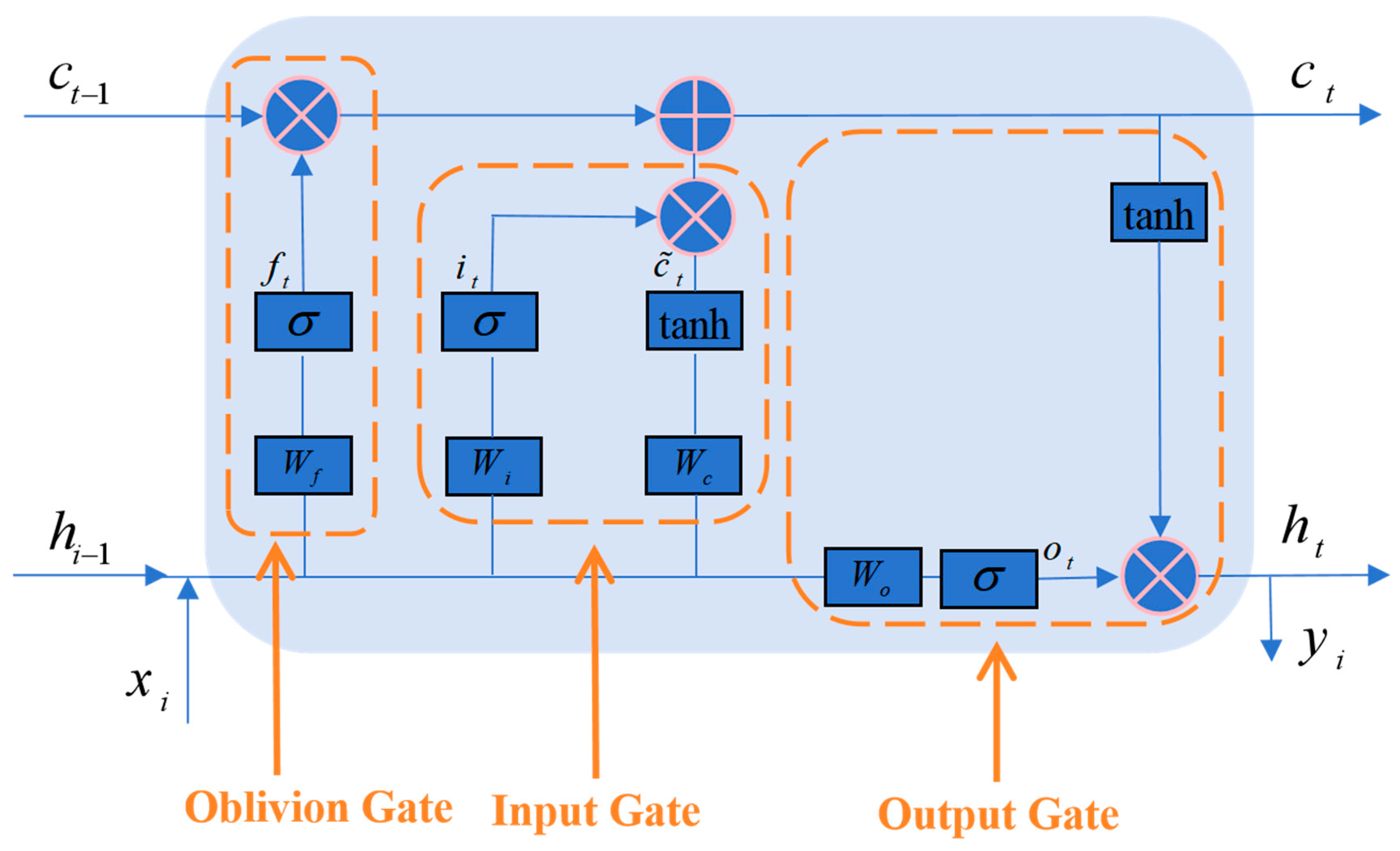 Here, and represent the cell states at the current time step and the previous time step , respectively.