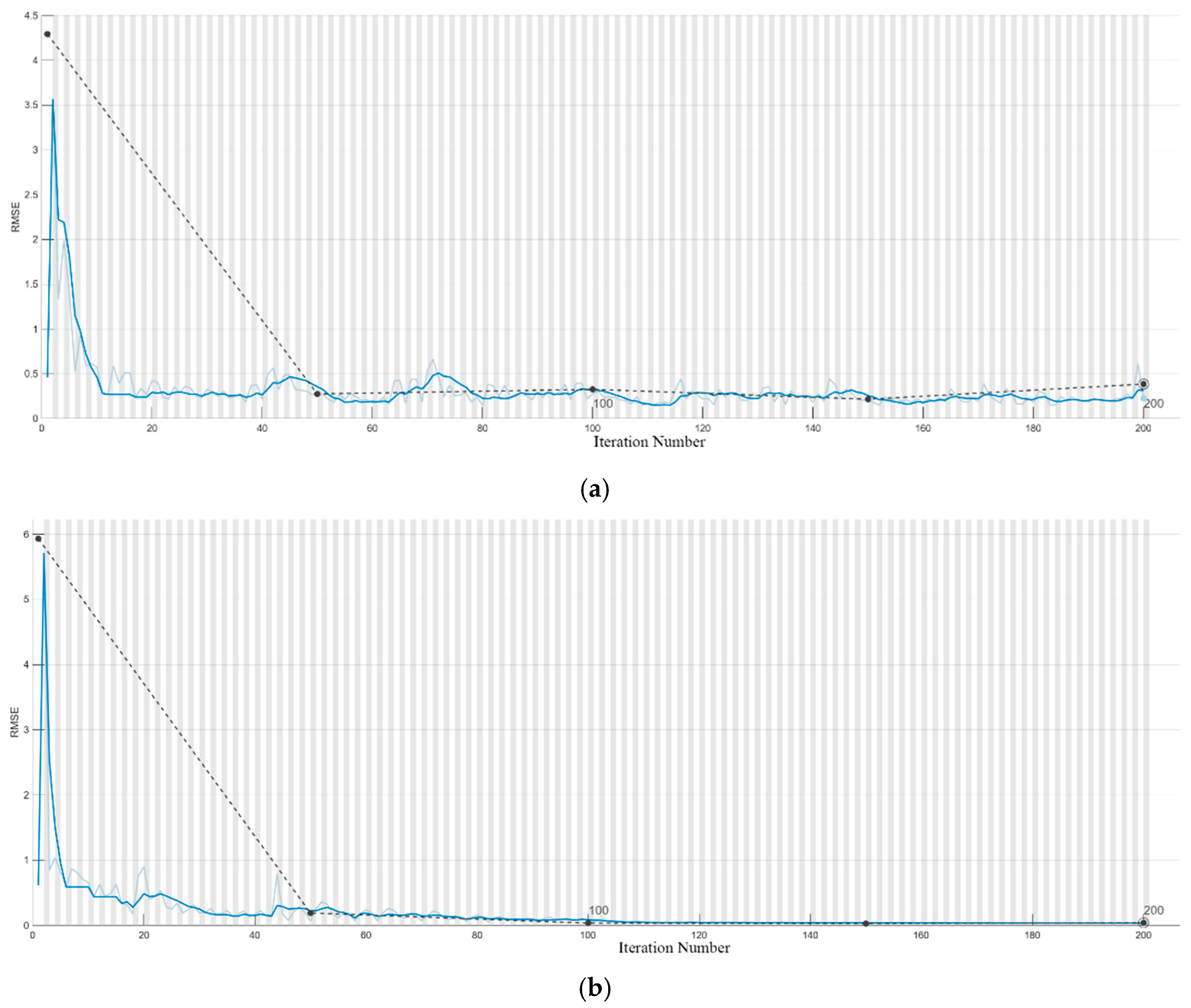 For the PSO LSTM network, temperature readings from points 2 and 18 served as inputs, and the predicted thermal error as the output. The input layer comprised three nodes, while both the output layer and the single hidden layer each contained one node. Of the 420 collected samples of machine tool temperatures and thermal errors, the first 360 were used for training and the remaining 60 for testing and validation. To enhance predictive performance, input and output datasets were normalized according to Equations (13)–(15). During LSTM training, the maximum number of iterations was set to 200, Mean Squared Error (MSE) was adopted as the evaluation metric, and the Adam optimizer was employed. The PSO algorithm was used to globally optimize the learning rate and hidden layer size. The swarm size was set to 40; the learning rate ranged from 0.01 to 0.15; the hidden layer neurons ranged from 1 to 200; acceleration coefficients c1 and c2 were both set to 2; the inertia weight linearly decreased from 1.2 to 0.8 over 30 iterations.