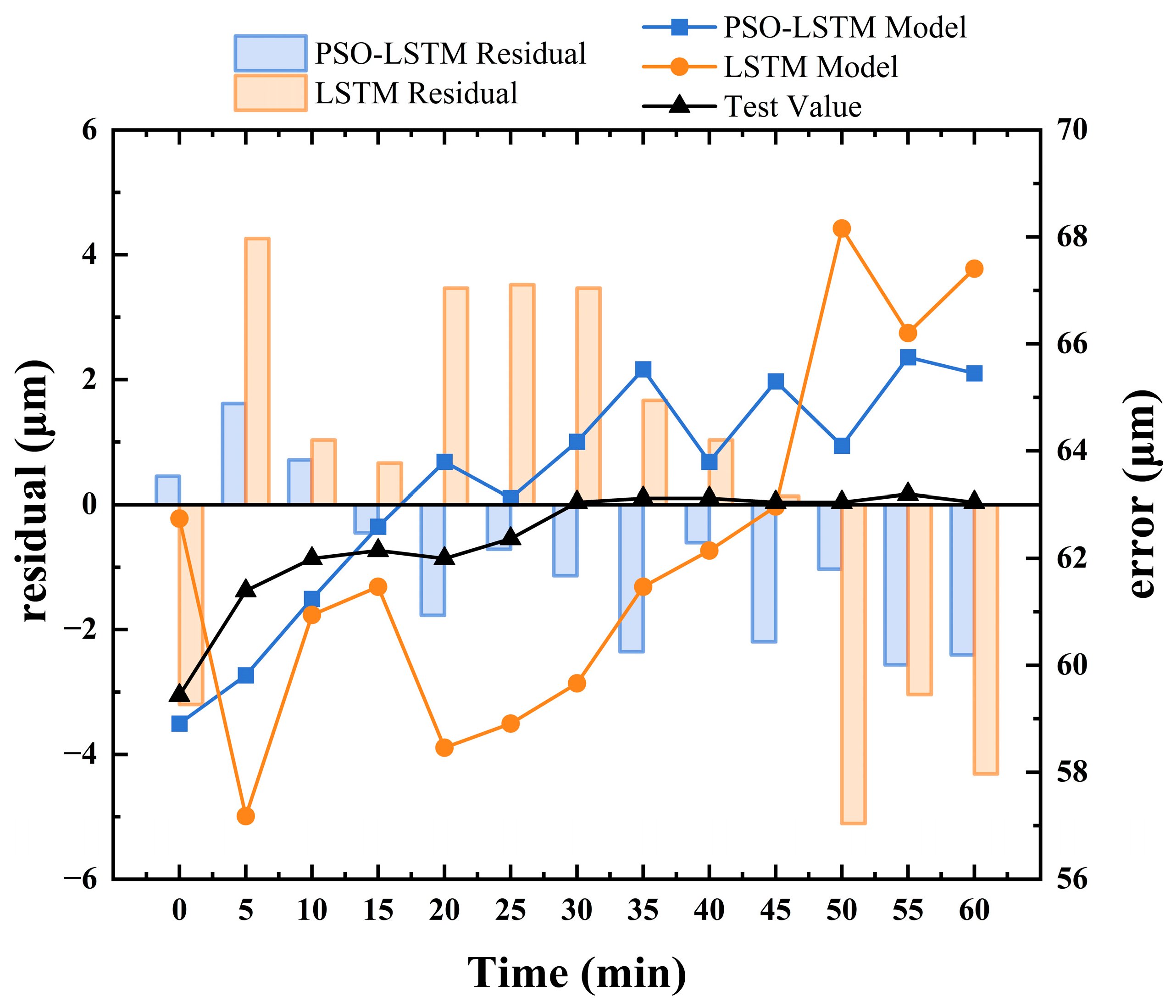Figure 13 shows the prediction comparison results and residual curves of the PSO-LSTM and LSTM neural network thermal error models. The PSO-LSTM predictions align almost perfectly with the measurements—particularly in the 10–45 min interval, where fluctuations are minimal and the fit is more consistent. Although the basic LSTM can predict thermal error reasonably well, it exhibits large deviations in several time segments. PSO-LSTM residuals largely remain within ±3 μm and fluctuate smoothly, whereas the LSTM model displays pronounced deviations and even sustained high errors in certain intervals. These comparisons indicate that the unoptimized LSTM is overly sensitive to operating-condition changes and lacks robustness, while PSO-LSTM offers greater stability across varying temperature-rise profiles. The underlying reason is that conventional LSTM models often rely on manual tuning or grid search for hyperparameters, making them prone to local optima, and their predictive performance heavily depends on hyperparameter choice. Integrating PSO enhances hyperparameter optimization by using swarm intelligence to explore the global solution space, facilitating the discovery of parameter sets that minimize error and maximize generalization. Moreover, because thermal error accumulates slowly, exhibits nonlinear trends, and is susceptible to early-stage temperature disturbances, an LSTM without proper tuning struggles to capture long-term dependencies; PSO-optimized LSTM, however, exhibits improved modeling of both long-sequence dependencies and nonlinear behaviors.