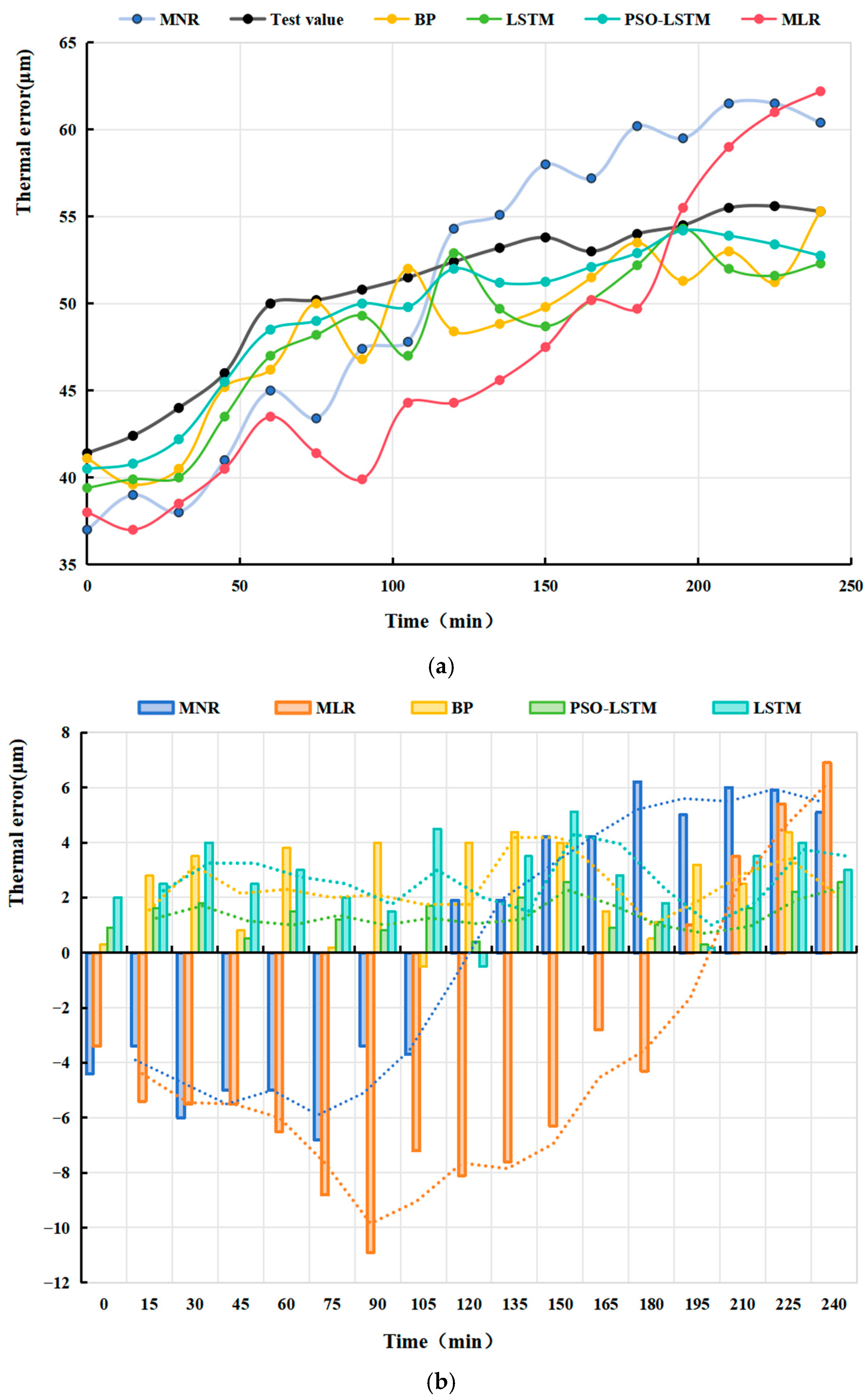 Compared to static models like MLR and MNR, the LSTM and PSO-LSTM thermal error prediction models can effectively capture long-term dependencies in time series, making them especially suitable for dynamic problems like CNC machine tool thermal error, which evolves slowly over time. This significantly enhances their ability to model the evolution of thermal error.