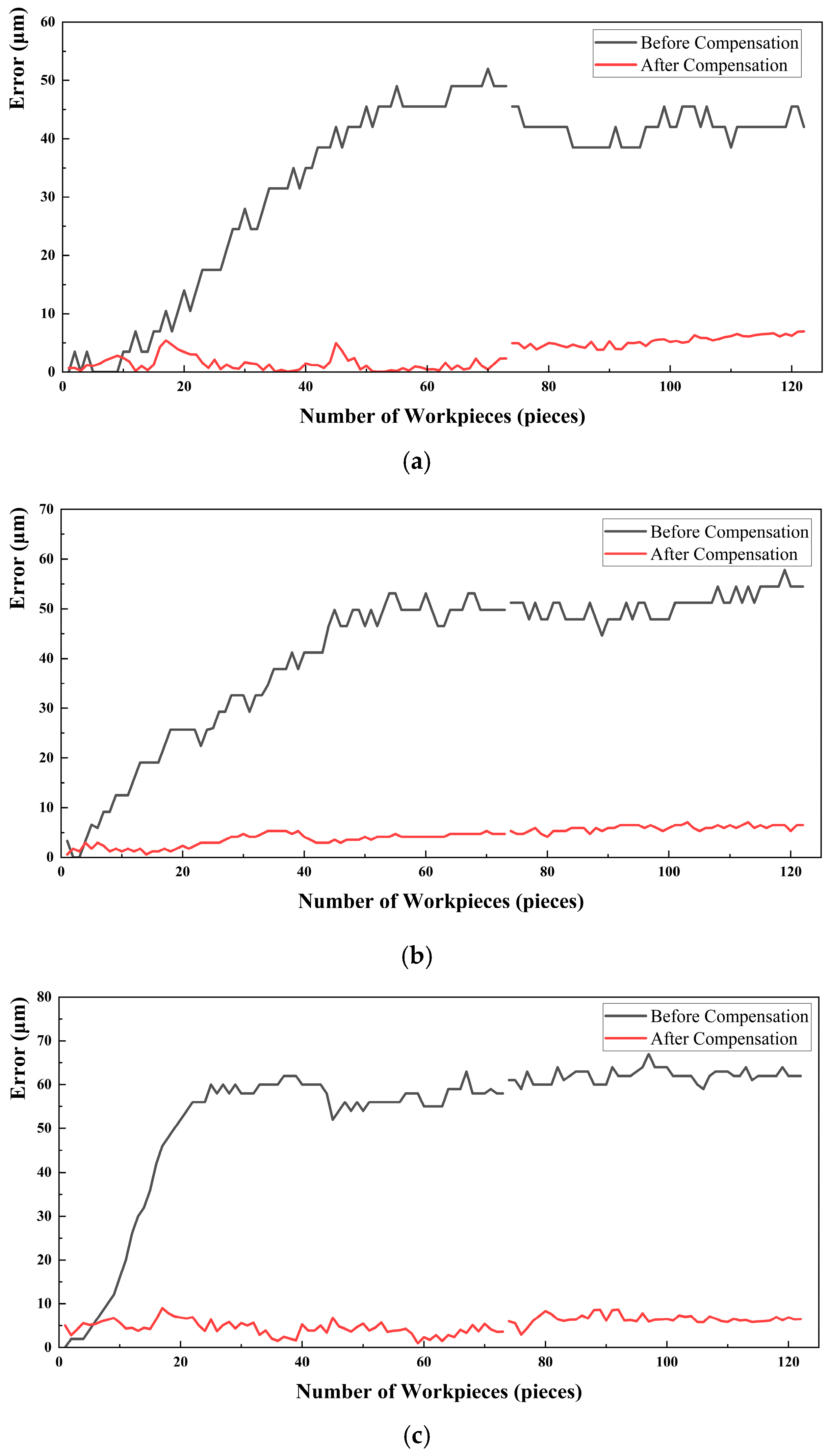 Figure 17 shows the thermal error compensation effectiveness of the CNC machine tools under different temperature conditions. The test results show that the environmental temperature has a significant impact on the machine tool’s thermal error. Under temperature variation conditions, the machine tool’s thermal error reached a maximum of 67 μm. Under three different environmental temperature conditions, the machining errors after system compensation were all controlled within 10 μm, and the machine tool’s machining precision was improved by up to 88%. This indicates that the thermal error compensation system for the SINUMERIK 828D CNC machine tool, designed in this paper, significantly improves the machining precision, demonstrating excellent practical application results.