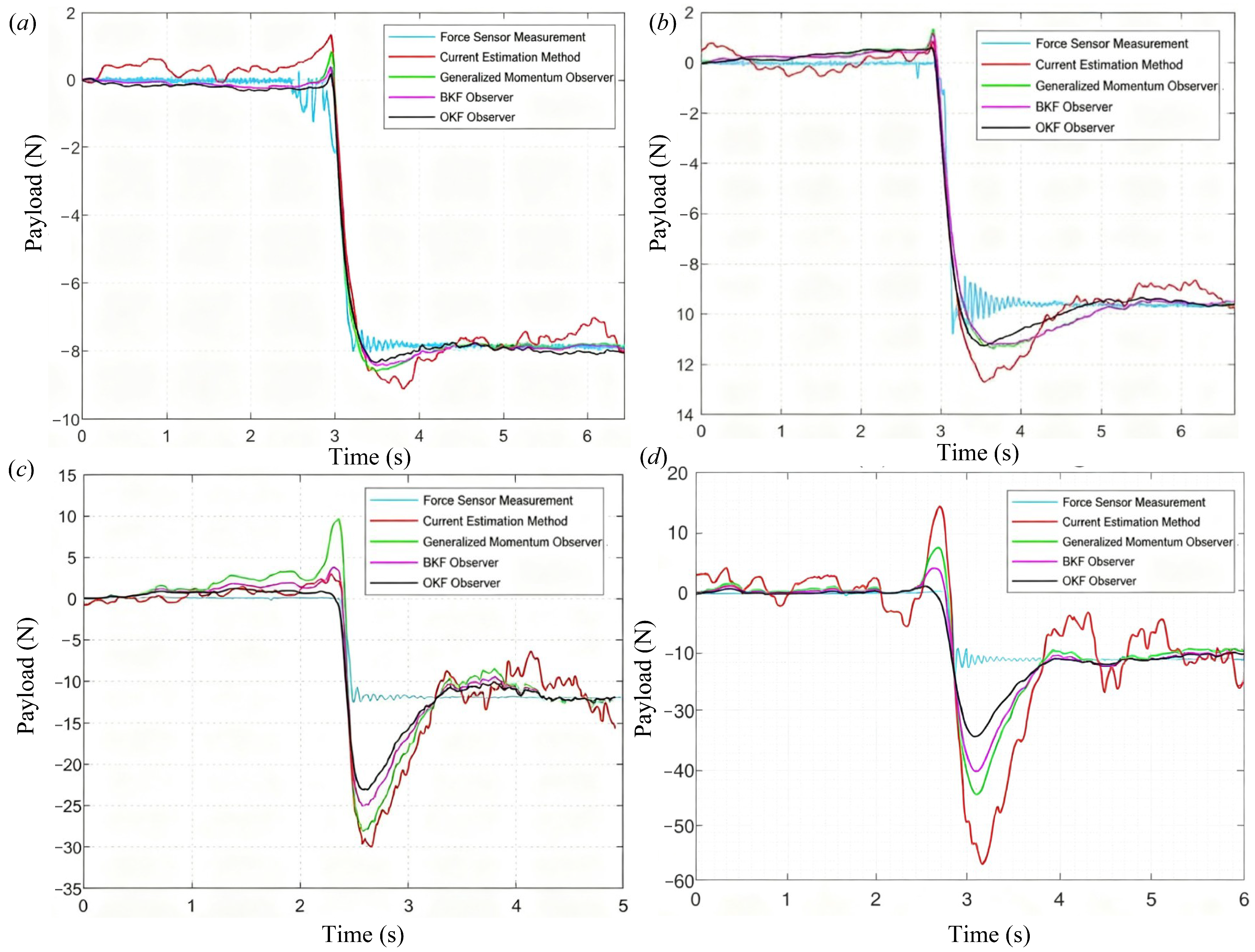 Figure 3. External load observation results of different methods: (a) load of 0.8 kg; (b) load of 1 kg; (c) load of 1.2 kg; (d) load of 1.5 kg.