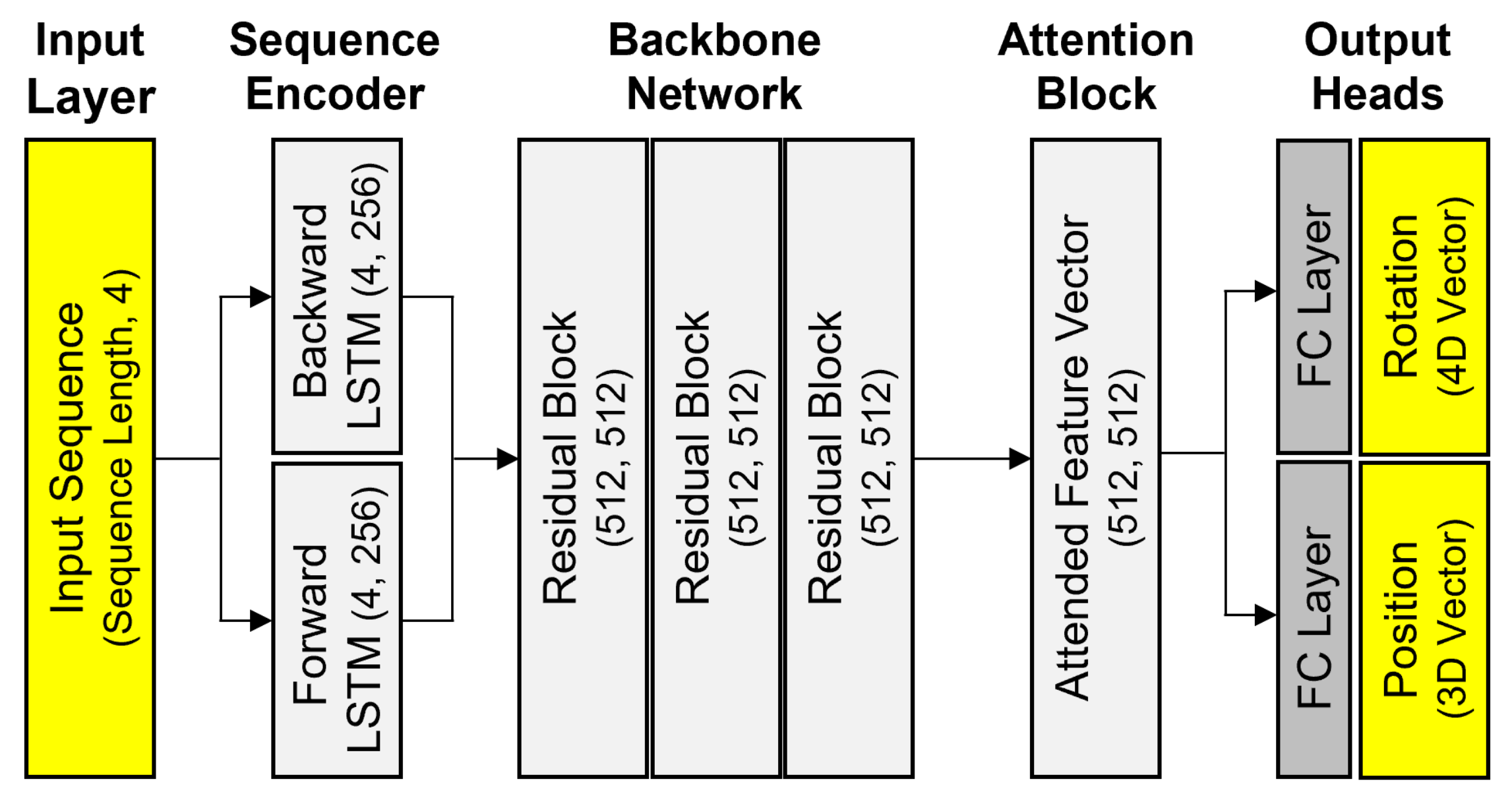 Figure 3, and it consists of a bidirectional LSTM layer to extract sequential features from the input data, residual blocks to deepen the expressive power of the extracted features, an attention block to re-weight the importance of features, and multi-task learning heads that independently predict position and rotation. Each component is organically designed to maximize prediction accuracy and the model’s generalization performance.