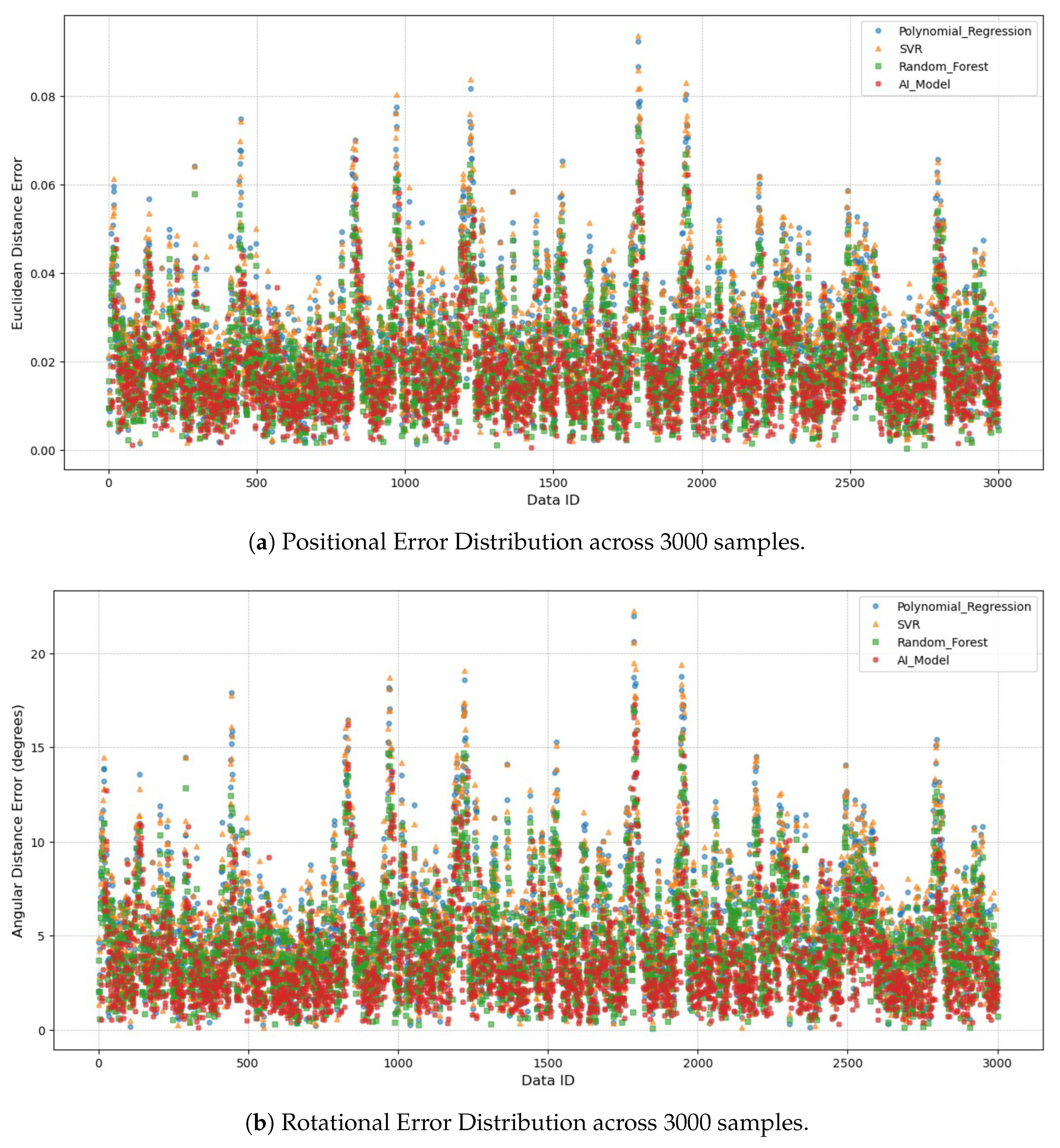 To verify the proposed model’s pure intrinsic performance, a simulation environment based on Unity and URDF, which excluded actual measurement noise, was constructed to generate a benchmark dataset. As a result of comparing the proposed model’s performance with the three baseline models—Polynomial Regression, SVR, and Random Forest—it was demonstrated that the proposed model achieved the most superior performance across all quantitative evaluation metrics (MAE, RMSE, Std). The position error MAE was 18.00 mm, and the rotation error MAE was recorded at 3.723 degrees, showing performance improvements of approximately 9.5% and 17.6%, respectively, compared to the second-place model, Random Forest.