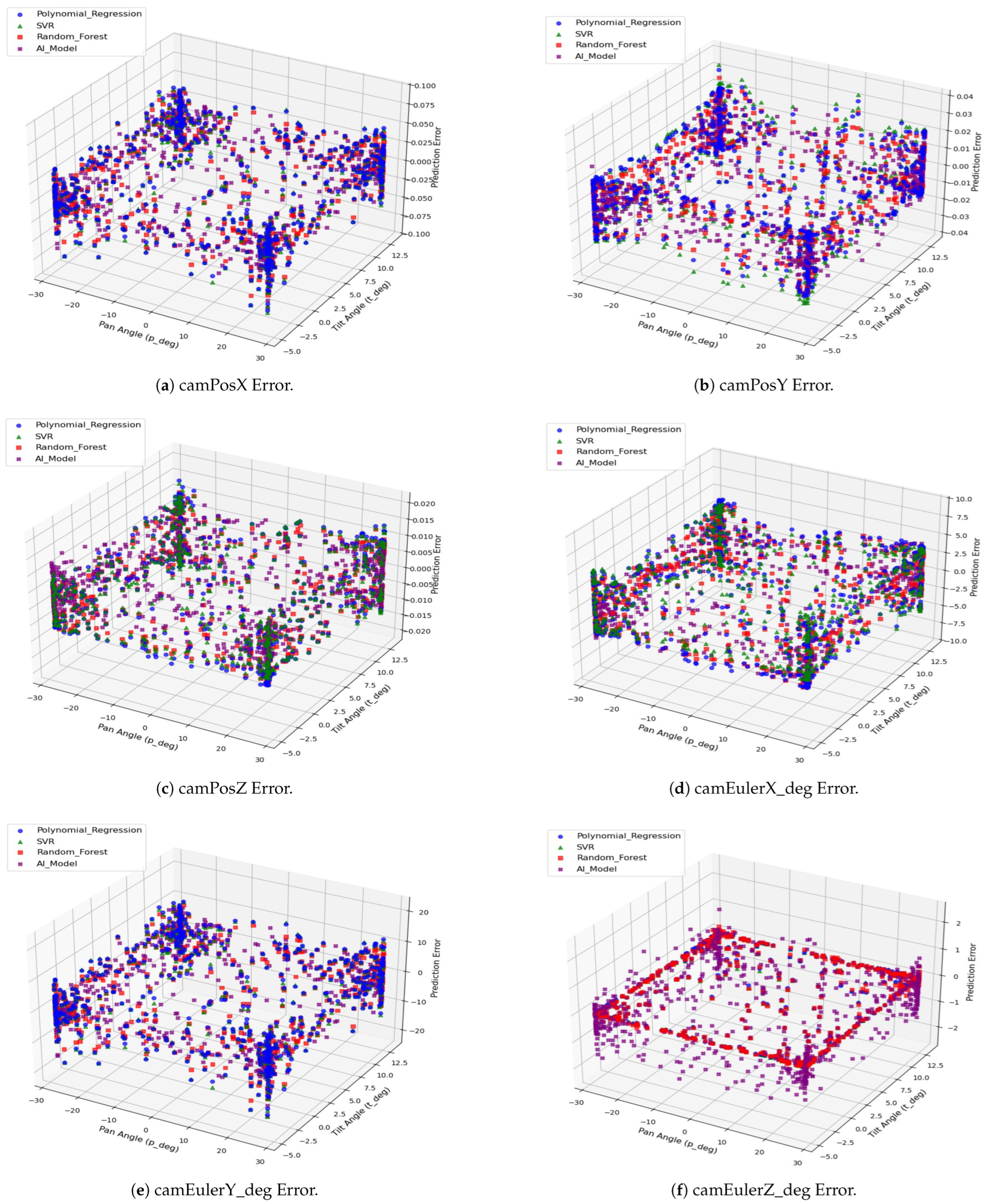 Z-axis rotation (camEulerZ_deg) error. In the case of position error (a–c), while all models commonly show a tendency for the error to increase at the boundaries of the operating range, the error of the proposed model (purple crosses) generally remains close to 0 and is stably distributed within a very narrow bandwidth. In contrast, Polynomial Regression (blue circles) and SVR (green triangles) frequently generate spike-shaped errors where predictions deviate significantly in specific regions, clearly showing the instability of the predictions. In the rotation error (d–f) analysis, the proposed model demonstrates superior performance with a significantly lower error distribution compared to the baseline models for