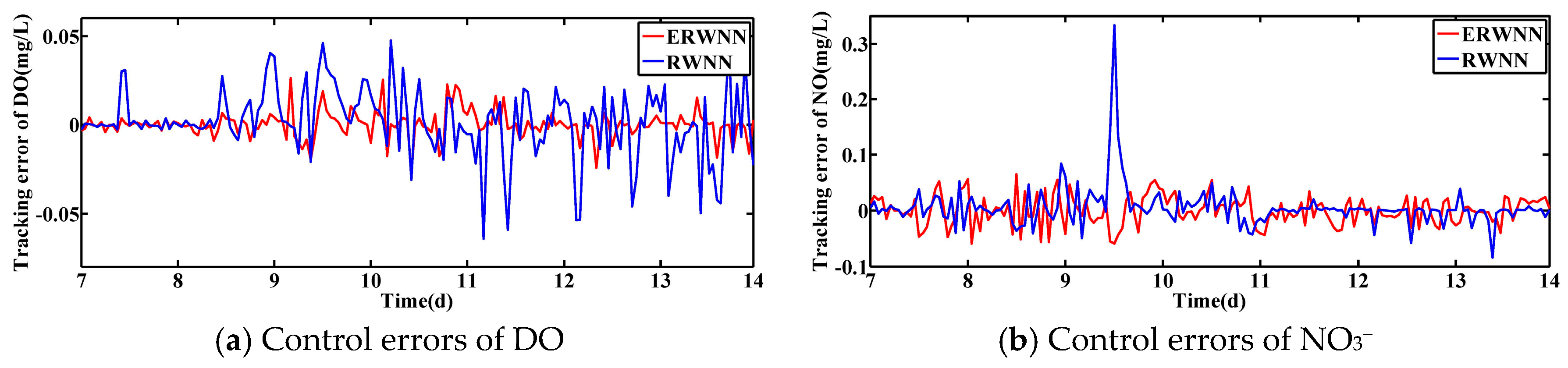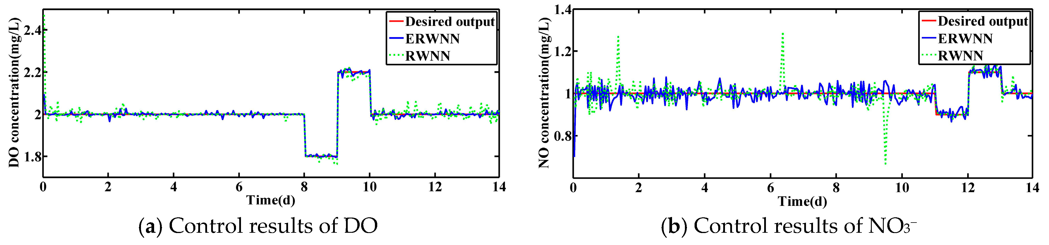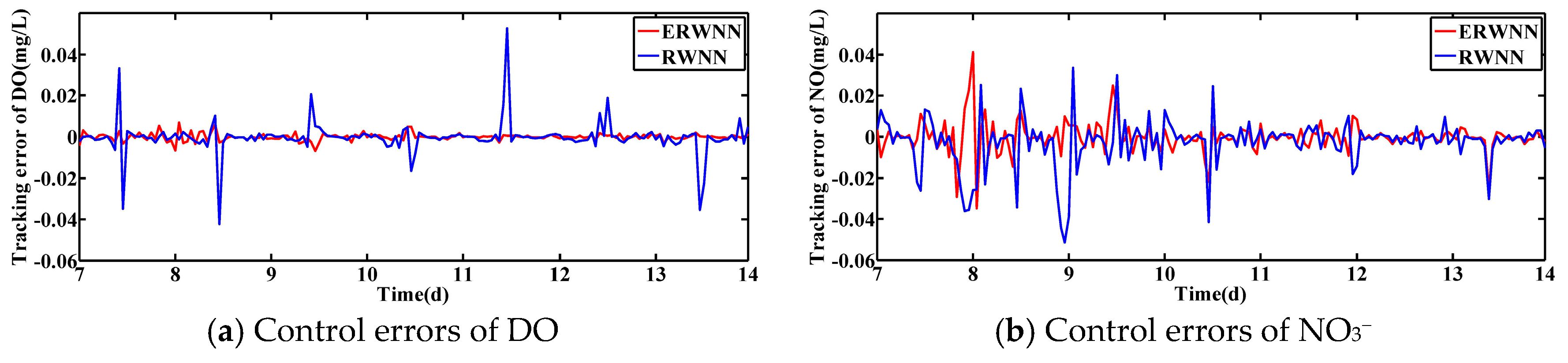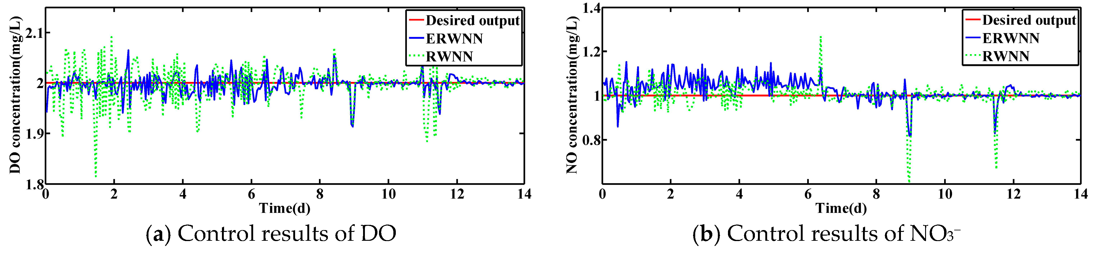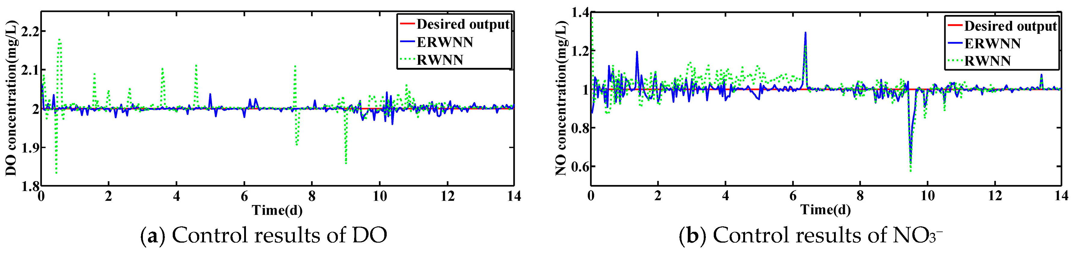 | Calculate the outputs of ERWNN and Calculate the DO concentration and NO3− concentration Update , , , and as () If the event E1 occurs If the event E2 occurs Otherwise , End End |