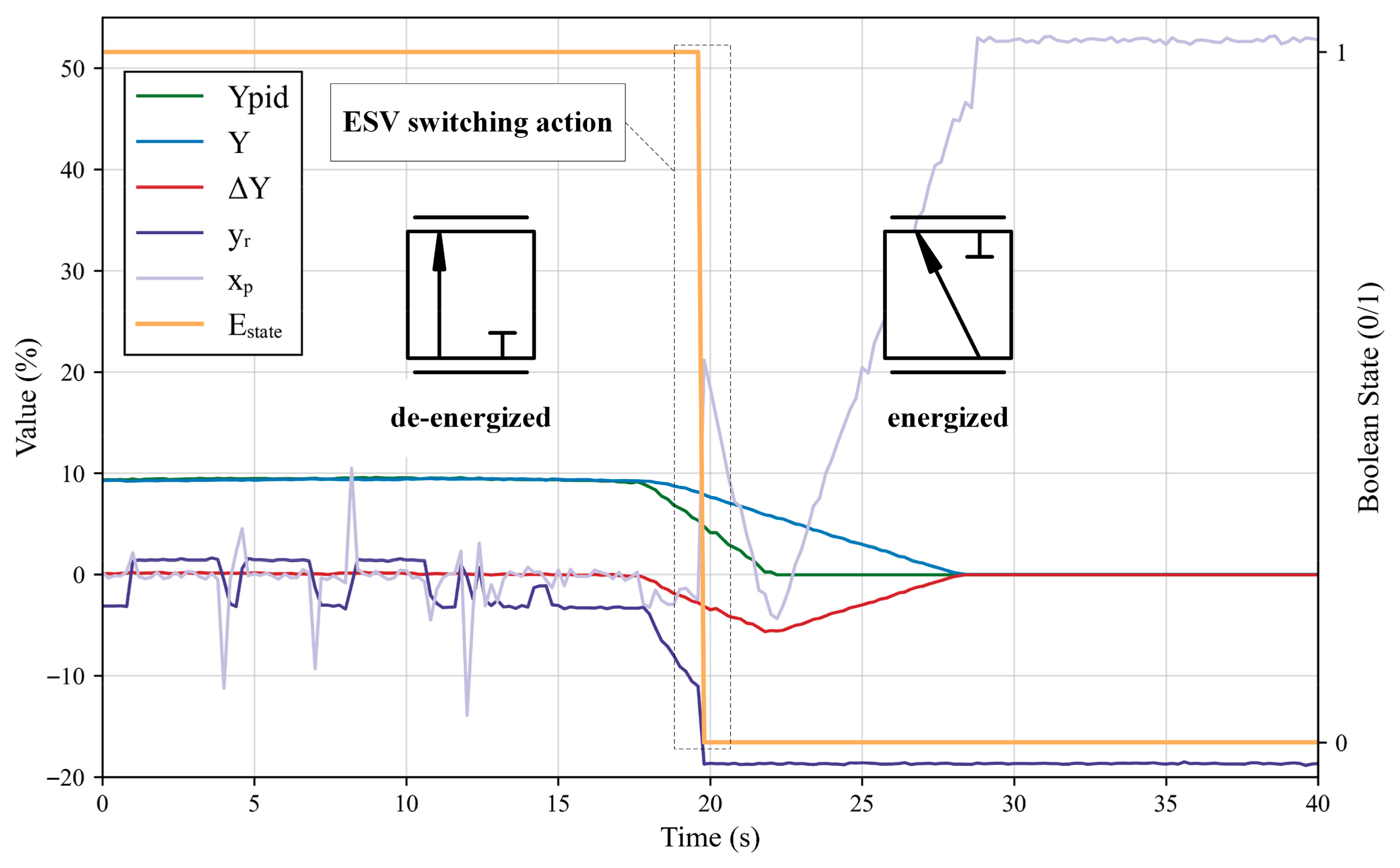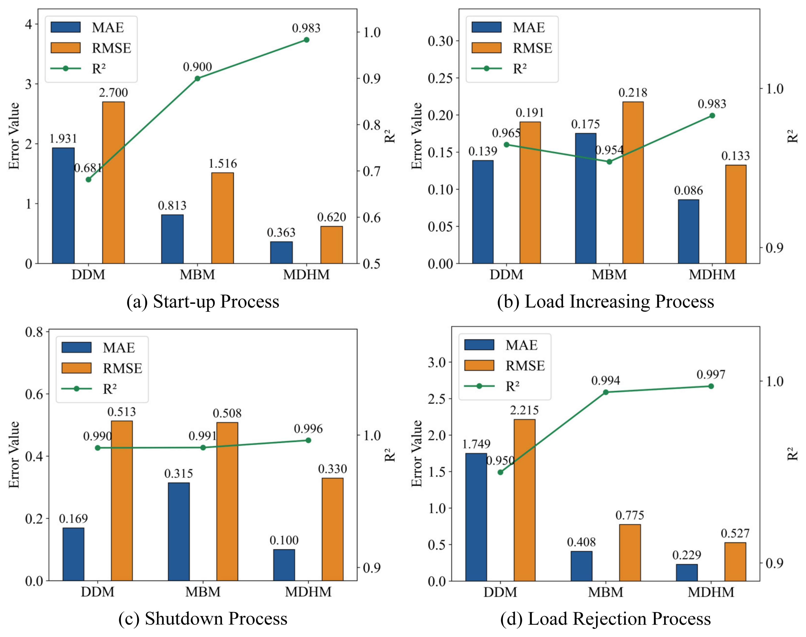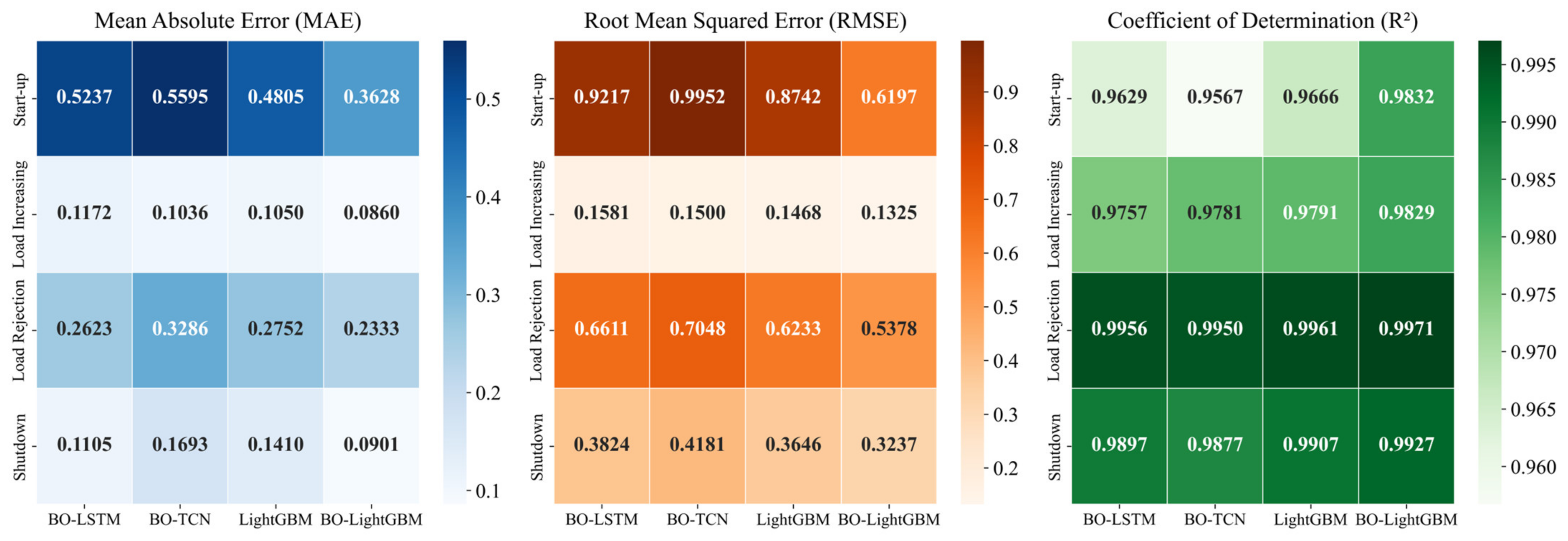 - The effectiveness and superiority of the proposed hybrid model were validated through comparative experiments under multiple operating conditions. The hybrid model demonstrated the best performance across the three tested typical dynamic processes and one extreme condition, achieving maximum MAE reductions of 68.3% and 86.9% compared with the mechanism-based and data-driven models, respectively. Further comparison results indicate that employing BO-LightGBM as the data-driven module in the hybrid framework yields higher accuracy and stability in simulating the MDV position.