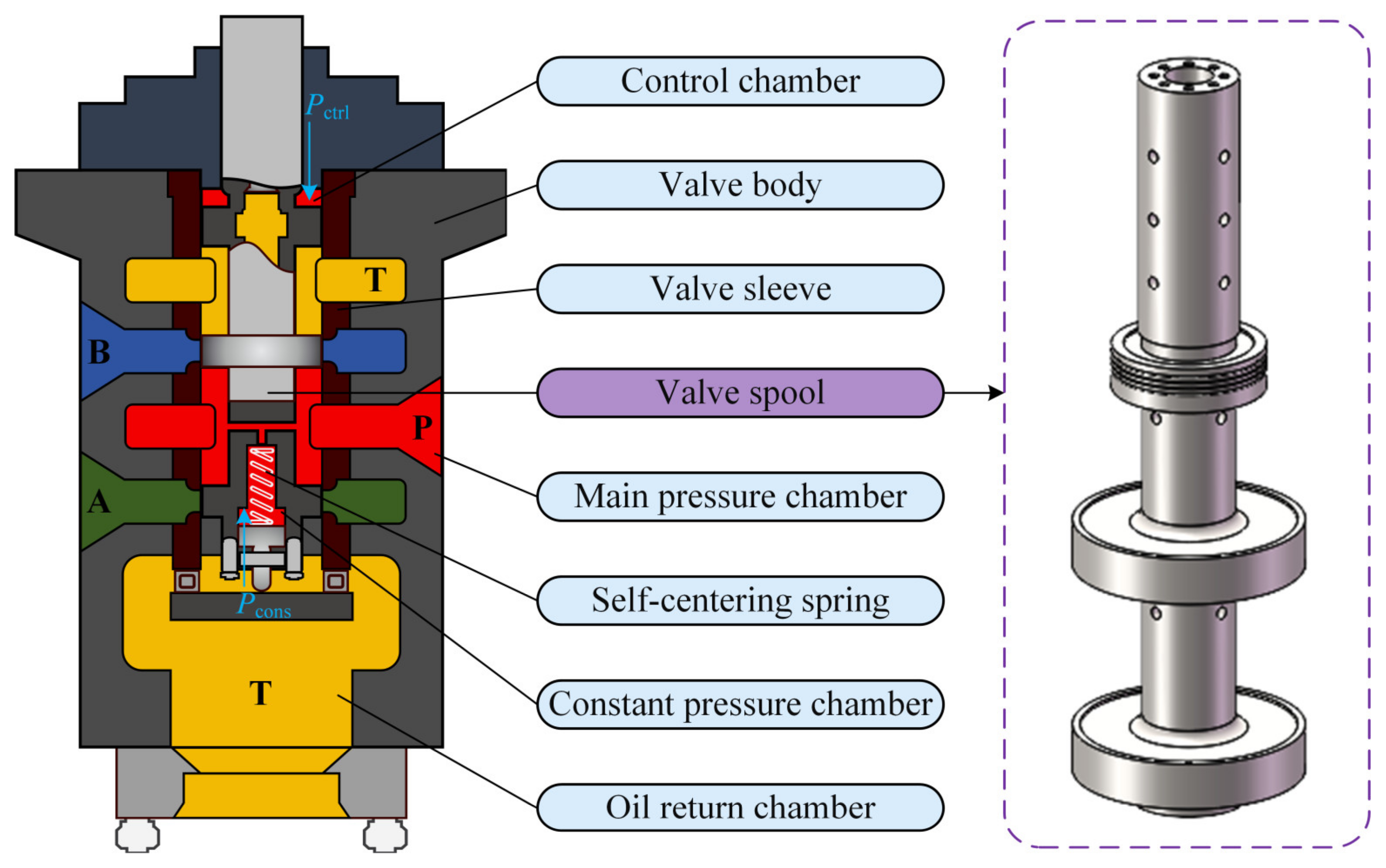 - Li, R.C.; Sun, Y.H.; Wu, X.W.; Zhang, P.; Li, D.F.; Lin, J.H.; Xia, Y.H.; Sun, Q.Y. Review of the Research on and Optimization of the Flow Force of Hydraulic Spool Valves. Processes 2023, 11, 2183. [Google Scholar] [CrossRef]