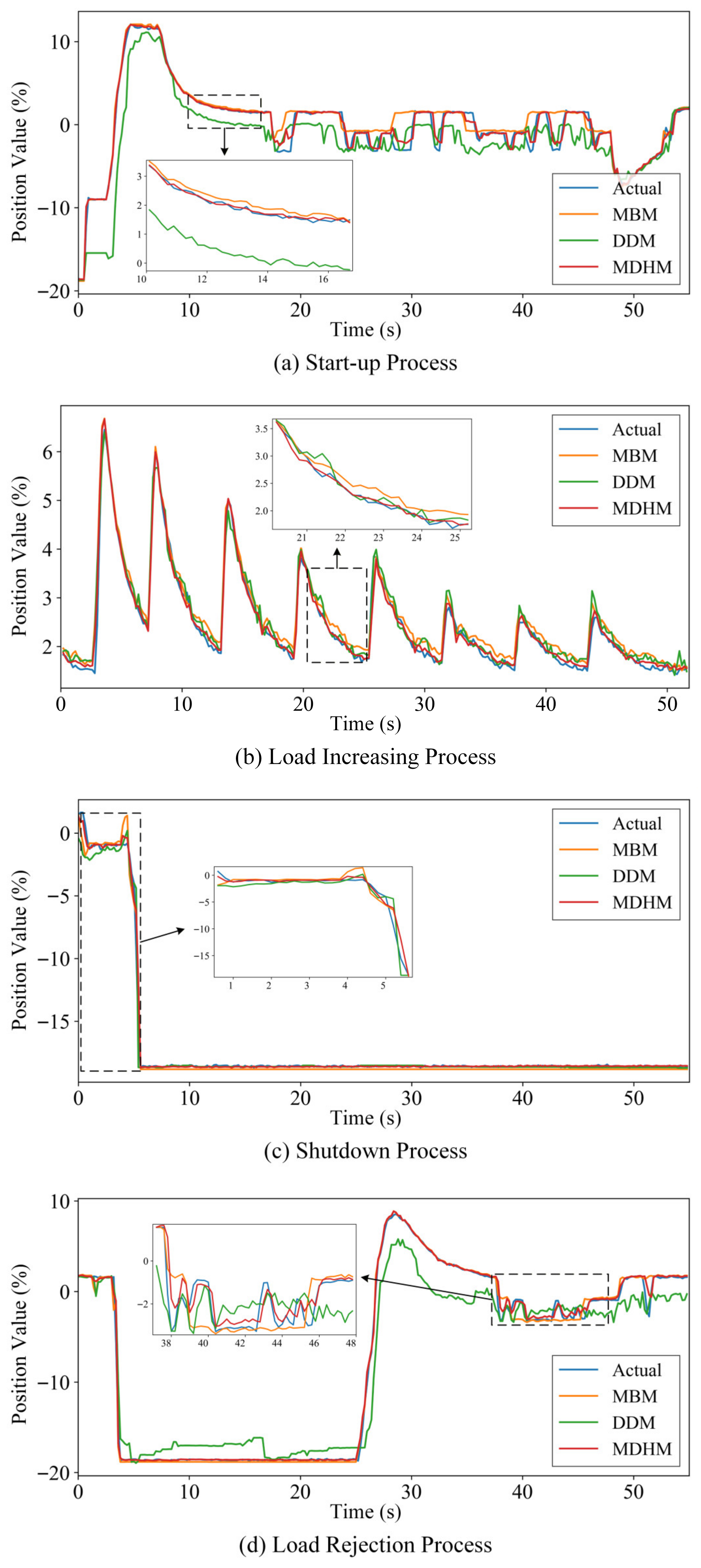 - Based on the actual operating dataset of the governor, comparative experiments are conducted under 4 typical dynamic processes—start-up, load increasing, shutdown, and load rejection—to verify the simulation accuracy and adaptability of the proposed modeling method in practical engineering scenarios.