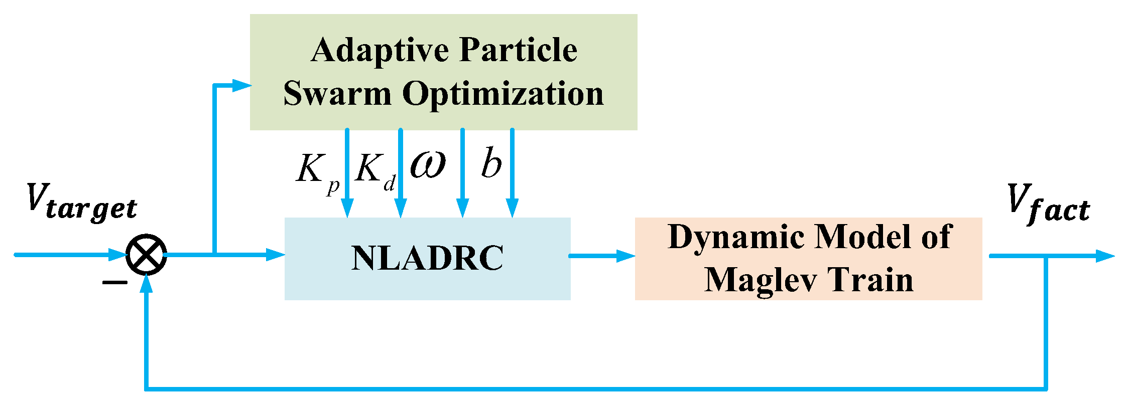 - Hu, L.; Fan, K.; Wei, L.; Tan, W.; Zeng, L.; Jia, Y. Design of Nonlinear Active Disturbance Rejection Controller Based on the Adaptive Particle Swarm Optimization Algorithm for the Maglev Train Traction Control System. J. Sens. 2023, 1, 6627429. [Google Scholar] [CrossRef]