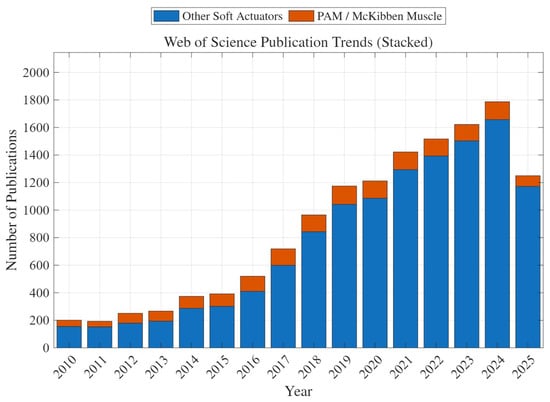 Annual publication trends (2010–September 2025) for soft actuators and pneumatic artificial muscle (PAM) actuators, based on Web of Science data.