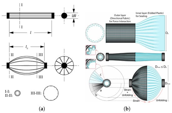 (a) Pleated PAM: uninflated (top) and inflated (bottom) []. Pressurization unfolds the membrane, shortening the actuator (from l to ) and generating radial expansion (III-III), as shown in the cross-sectional views. (b) The final pfPAM design and the layer-by-layer transformation of the shells’ shape and dimensions from two perspectives [].