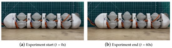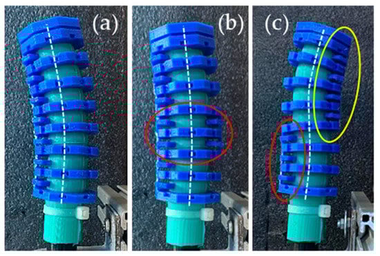 A representative example is a vacuum-powered PAM design with manually reconfigurable external reinforcements []. In this system, stacked elastomeric air chambers are constrained by rigid rings and a flexible membrane. By replacing external reinforcement elements, the actuator can generate bending, twisting, shearing, or rotary motions. In a six-chamber configuration, see Figure 8a, the actuator achieved 290° twisting and 255 ° bending, demonstrating its potential for bioinspired motion tasks such as crawling robots.