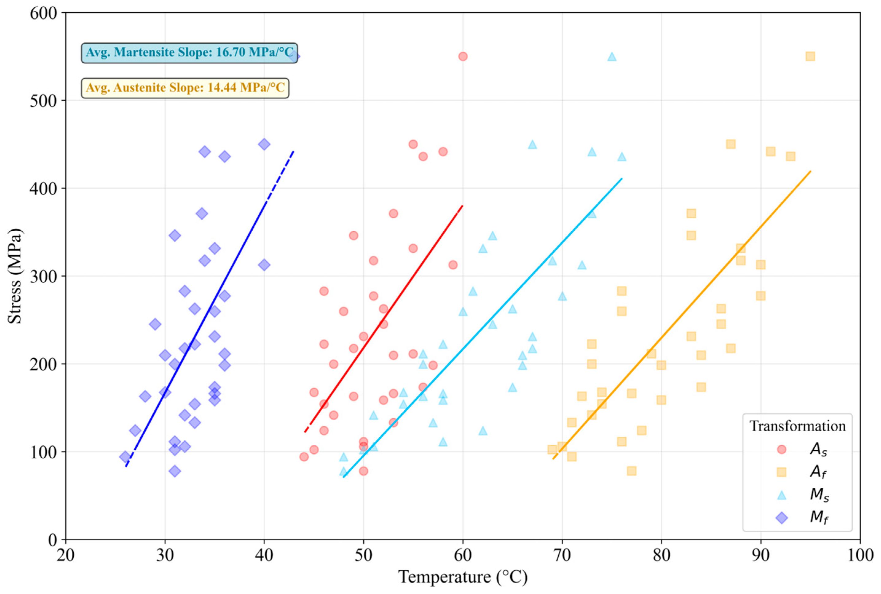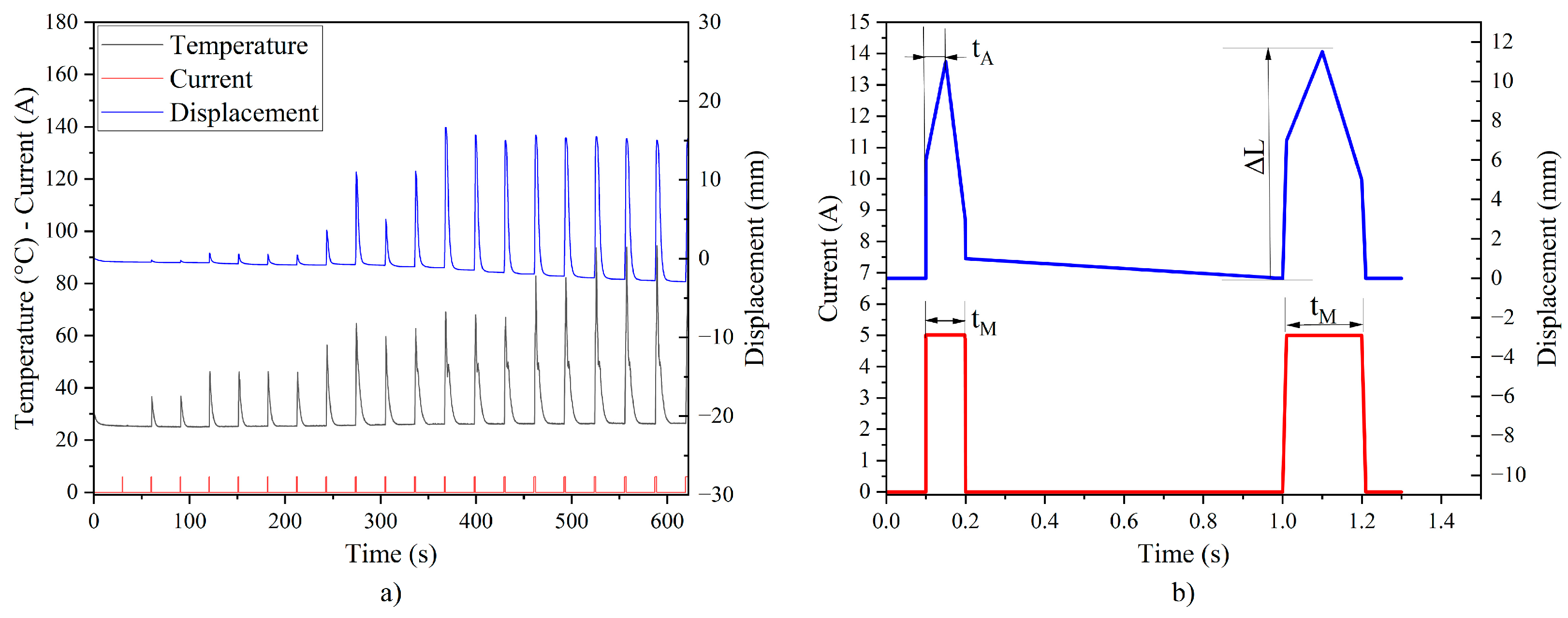 - Vollach, S.; Shilo, D. The Mechanical Response of Shape Memory Alloys Under a Rapid Heating Pulse. Exp. Mech. 2010, 50, 803–811. [Google Scholar] [CrossRef]