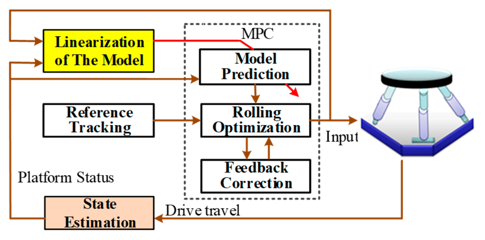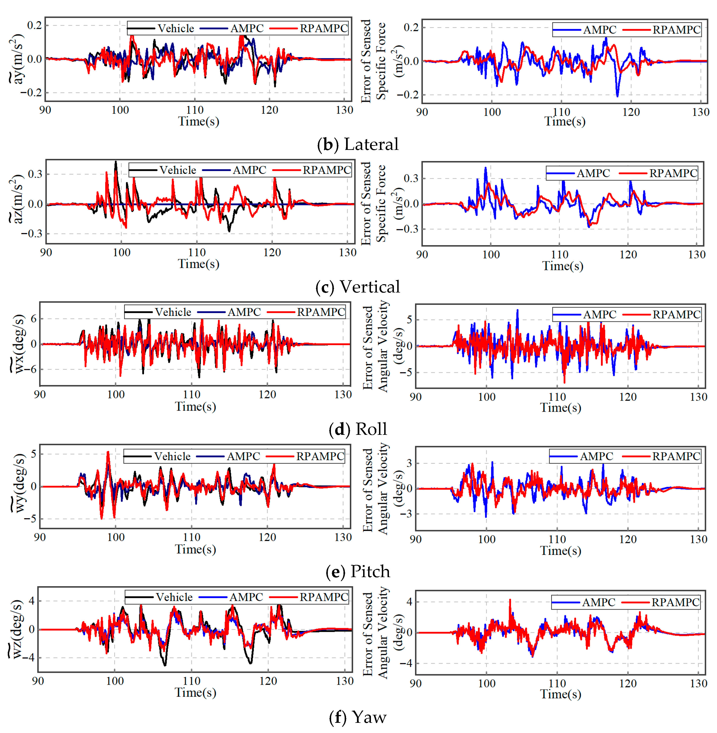- An AMPC motion cueing algorithm integrated with EKF-based state estimation is developed, whereby real-time, filtered platform states are provided to enhance the consistency between the predictive model and the actual system dynamics. This integration enables a closed-loop prediction–estimation–optimization structure, leading to improved robustness and tracking performance under complex road excitations.