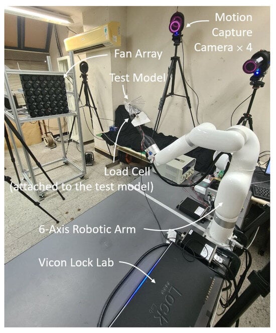The experimental setup incorporates a six-degree-of-freedom robotic arm, a fan array, a load cell, a motion capture system, and a motion capture control system that synchronizes the motion capture data and load cell measurement.