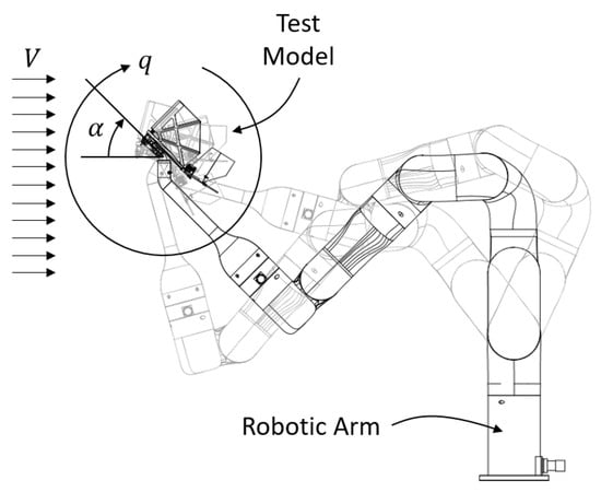 To capture the dynamic damping characteristics of the pitching motion, the robotic arm was programmed to articulate a trajectory such that the test model rotated about its CG, as illustrated in Figure 5. The angle between the axis of the test model and the incoming flow was defined as the AoA (), while the rotational rate was defined as the pitch rate ().