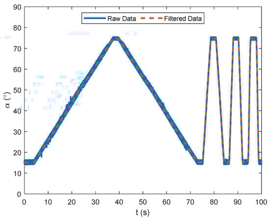 The AoA induced by the robotic arm. One slow cycle for static measurement, followed by three significantly faster cycles for dynamic measurement. This dataset corresponds to Test 1.