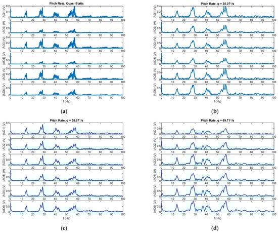 FFT of segmented six-channel load cell raw data: (a) Segment 1: quasi-static; (b) Segment 2: pitch rate ; (c) Segment 3: pitch rate ; and (d) Segment 4: pitch rate . This dataset corresponds to Test 1.