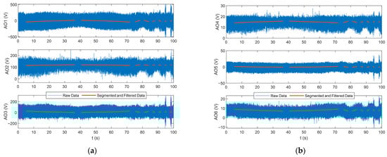 Segmented and filtered six-channel load cell signals with raw data overlay: (a) Channel 1 to 3; (b) Channel 4 to 5. This dataset corresponds to Test 1.