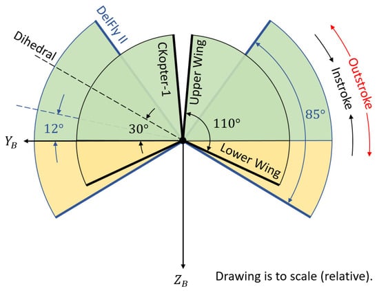 It should be noted, however, that the CKopter-1 features a larger dihedral angle and flap amplitude, resulting in a greater wing stroke above the fuselage as illustrated in Figure 10.
