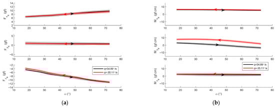 The dynamic cases were conducted at pitch rates of , , and . Figure 13 illustrates the forces and moments measured when the CKopter-1 test model was pitched at . The arrows denote the direction of the pitching motion, while the shaded regions represent the standard deviation. It is evident that only the pitching moment exhibits a significant difference between the forward and backward cycles. The vertical shift in the pitching moment data indicates that the pitch rate introduces either an increment or a decrement, providing clear evidence of the stability derivative .