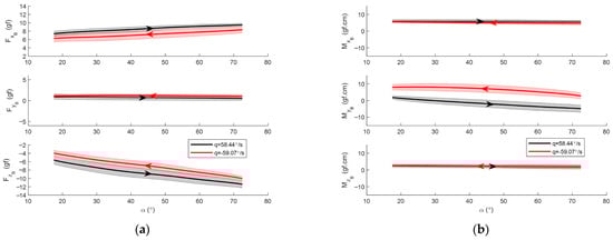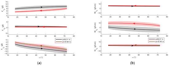 Averaged dynamic forces and moments at : (a) forces along the body axes versus AoA; (b) moments along the body axes versus AoA. Shaded area indicates ±1 standard deviation. Arrows indicate direction of pitching motion.