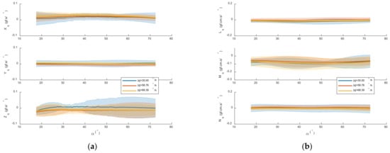 More specifically, the objective of the experiment was to capture the dynamic effects of the pitching motion, which are conventionally characterized by the partial derivatives of the aerodynamic forces and moment with respect to the pitch rate. At every prescribed AoA, Equations (7)–(12) were applied to determine the dynamic damping terms for the aerodynamic forces and the moment about the body-fixed frame.