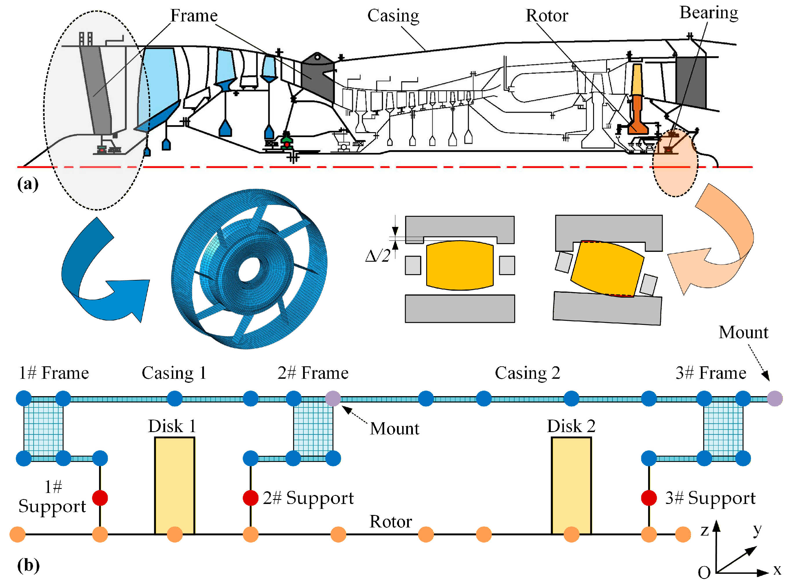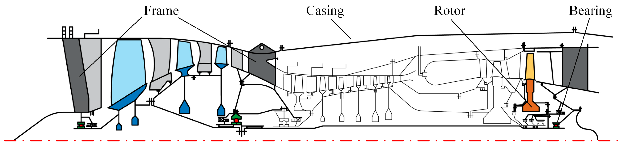 - Liu, J.; Fei, Q.; Wu, S.; Tang, Z.; Zhang, D. Nonlinear Vibration Response of a Complex Aeroengine under the Rubbing Fault. Nonlinear Dyn. 2021, 106, 1869–1890. [Google Scholar] [CrossRef]