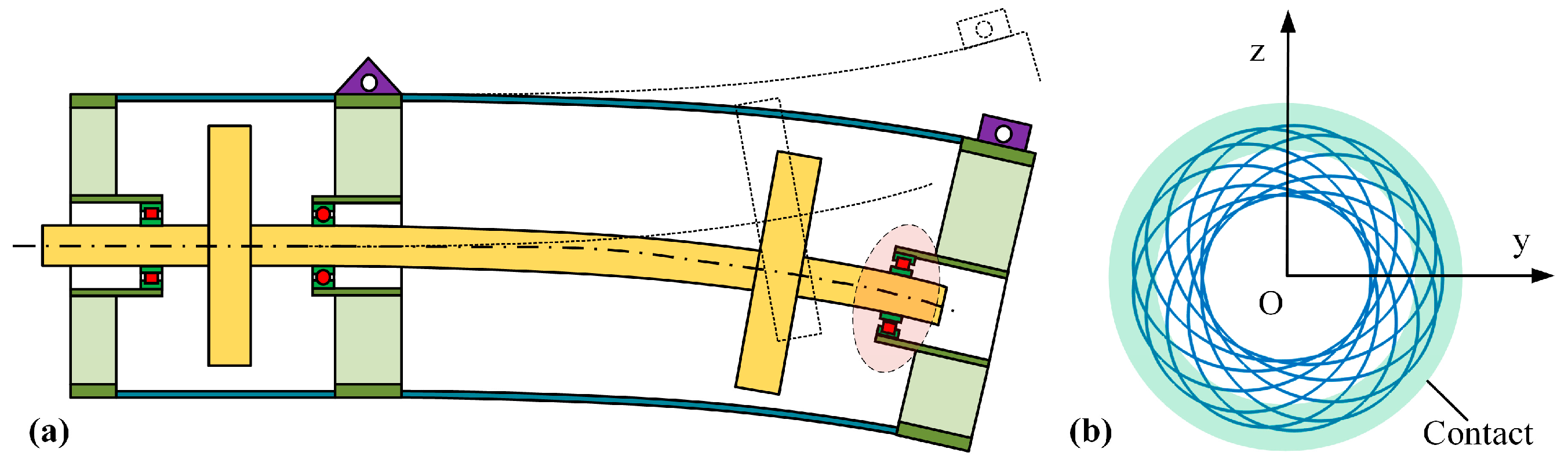 - Xu, H.; Yang, Y.; Ma, H.; Luo, Z.; Li, X.; Han, Q.; Wen, B. Vibration Characteristics of Bearing-Rotor Systems with Inner Ring Dynamic Misalignment. Int. J. Mech. Sci. 2022, 230, 107536. [Google Scholar] [CrossRef]