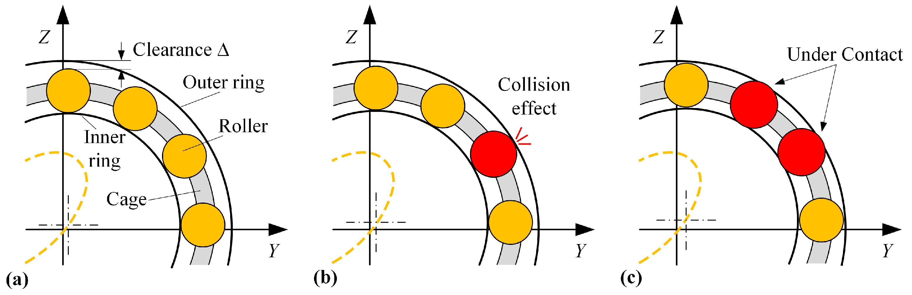 - Xu, H.Y.; Wang, P.F.; Ma, H.; Yang, Y.; Li, X.P.; Luo, Z.; Han, Q.K.; Wen, B.C. Dynamic Behaviors and Contact Characteristics of Ball Bearings in a Multi-Supported Rotor System under the Effects of 3D Clearance Fit. Mech. Syst. Signal Process. 2023, 196, 32. [Google Scholar] [CrossRef]