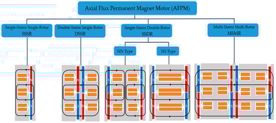 AFPM motors can be classified into several topological structures depending on the arrangement of stators and rotors. Figure 1 illustrates four typical configurations: single-stator single-rotor (SSSR), double-stator single-rotor (DSSR), single-stator double-rotor (SSDR), and multi-stator multi-rotor (MSMR). Each topology offers distinct advantages and limitations, making it suitable for specific applications. The SSSR topology consists of a single stator and a single rotor. This configuration is structurally the simplest among AFPM designs and offers high power density due to the short axial length and direct magnetic coupling between the stator and rotor. However, because the magnetic attraction between the stator and rotor is unbalanced, the SSSR topology experiences significant axial magnetic forces. This imbalance can lead to increased vibration, mechanical stress on bearings, and reduced operational lifetime, particularly in high-speed applications. The DSSR topology incorporates two stators positioned on either side of a single rotor. This arrangement balances the axial forces acting on the rotor, reducing vibration and improving mechanical stability compared to SSSR. Depending on the design, the permanent magnets can be mounted on the rotor surface or embedded within the rotor core. Surface-mounted designs are generally easier to manufacture, whereas embedded designs protect the magnets from mechanical damage and demagnetization. DSSR motors are particularly suited for applications that require moderate axial compactness while maintaining mechanical robustness. The SSDR topology features a single stator placed between two rotors. This design provides inherent axial force balancing because the magnetic attraction from each rotor acts in opposite directions on the stator. As a result, SSDR motors exhibit reduced bearing loads and enhanced structural stability, making them advantageous for high-torque and high-reliability applications. Furthermore, the doubled rotor surface area increases the torque output without increasing the motor diameter, thereby improving torque density [1,16].