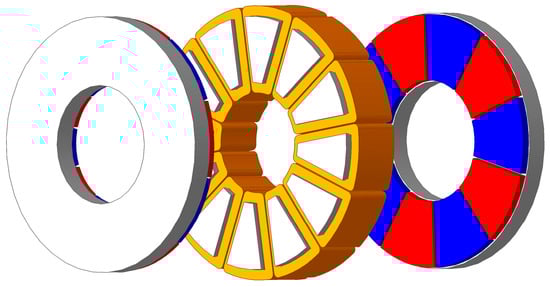 The YASA topology is a specialized variant of the AFPM motor that eliminates the continuous yoke in the stator and employs segmented armature teeth [2,18], as illustrated in Figure 2. Instead of a conventional ring-shaped stator core, the stator is composed of discrete, individually wound tooth segments that are positioned between two rotor discs. Each segment is mechanically fixed and electrically connected to form the complete stator winding configuration. By removing the stator yoke, the magnetic flux path between the rotor permanent magnets and the stator teeth becomes shorter and more direct. This design reduces the overall mass of active materials, particularly iron, which leads to lower iron losses and improved efficiency [5,19]. Furthermore, the absence of a continuous yoke reduces the circumferential flux leakage, thereby enhancing the effective utilization of the magnetic flux generated by the permanent magnet. One of the key advantages of the YASA topology is its high torque density. The double-rotor, single-stator arrangement inherently balances axial forces, minimizing mechanical stress on the bearings. Additionally, the segmented stator construction facilitates modular manufacturing, allowing for simplified coil winding, improved cooling access, and straightforward replacement or maintenance of individual segments. The modular nature of the stator also enables scalable manufacturing, as the same segment design can be used to assemble motors of varying diameters and ratings. From a thermal management perspective, the segmented armature structure provides increased surface area and open pathways for airflow or liquid cooling, resulting in improved heat dissipation from the stator windings. This thermal advantage allows the motor to sustain higher continuous current densities without overheating, which directly contributes to higher continuous torque output [5].