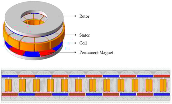 The AFPM motor features a unique structure that operates based on the principle of electromagnetic induction. As shown in Figure 3, the motor’s magnetic flux predominantly flows along the axial direction. The generated magnetic field interacts with the magnetic field of the rotor’s permanent magnets to form a closed magnetic flux circuit [21].