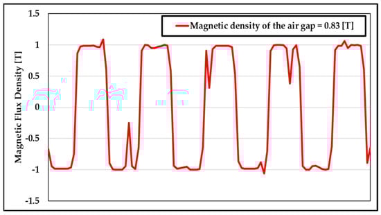 The magnetic flux density distribution in the designed AFPM motor was analyzed through 3D-FEA. The airgap flux density, shown in Figure 4, was maintained below 1.05 T, ensuring that the magnetic circuit operates within the unsaturated region.